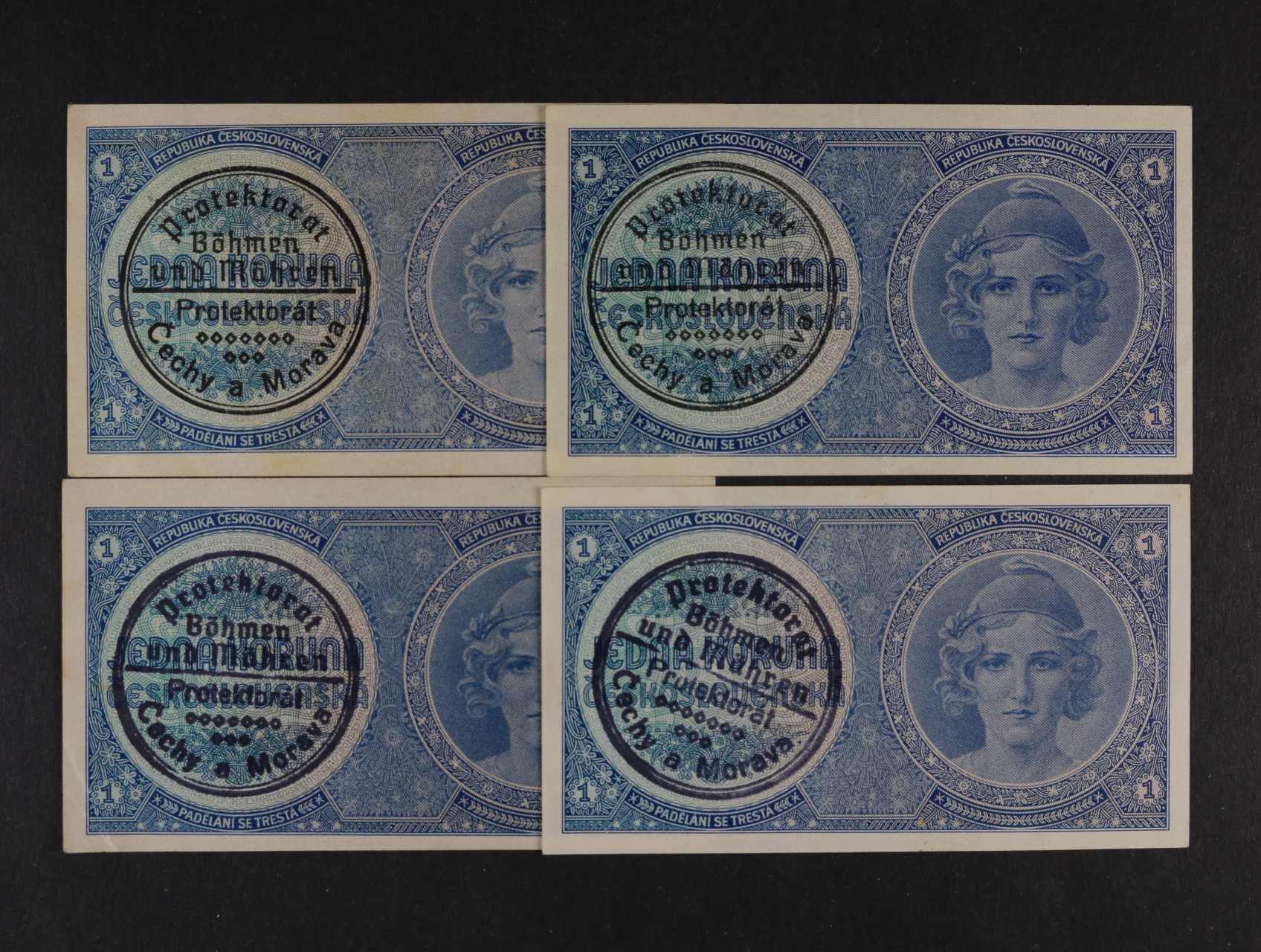 • 1 Kč 1938/40 s ručním raz. A 008, A 056 a strojním raz. A 002, A 007, Ba. 28a, b, Pi. 1a, b (4ks)