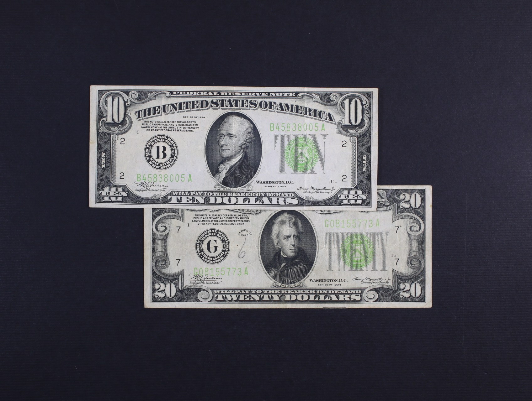 • 10 Dollars 1934 (B New York / New York), 20 Dollars 1934 (G Chicago / Illinois) Federal Reserve Note, světle zelené pečetě, Pi. 429L, 430L