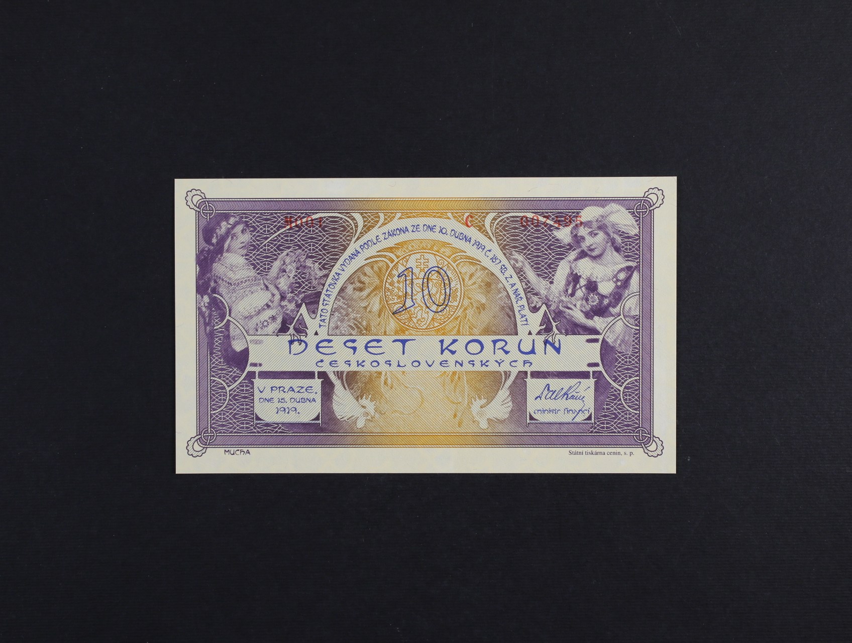 • 10 Kč 1919 novotisk původního návrhu série M001 007495, vydání pro ČNB se sérií nad 7000 na papíře s vodoznakem a bez UV tisku - vydání ČNB 2022