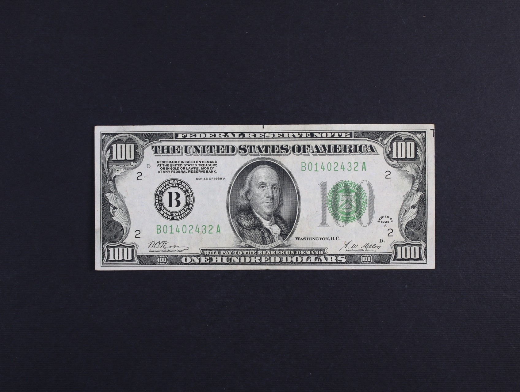 100 Dollars 1928 A (B New York / New York) Federal Reserve Note, tmavě zelená pečeť, Pi. 424a
