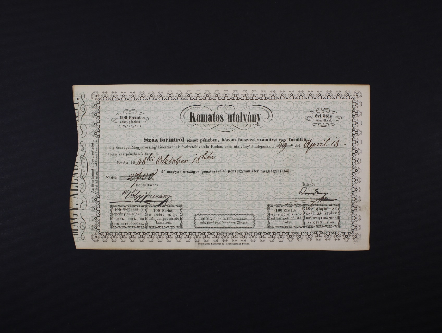 • 100 Forint / Gulden 18.10.1848 do 18.4.1849, platnost 6 měsíců, Ri. 401, neperforovaný, vzácný, krásný stav