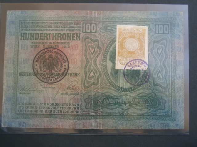 • 100 Kronen 2.1.1912, jugoslávský přetisk, slovinský kolek, srbské místní razítko, Pi. 9B