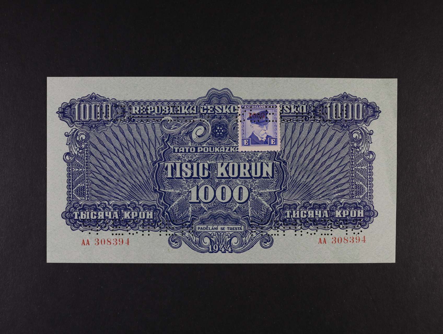 • 1000 K 1944 série AA kolkovaná bankovní vzor s 4x perforací SPECIMEN, Ba. 68, Kar. 65, Pi. 57s