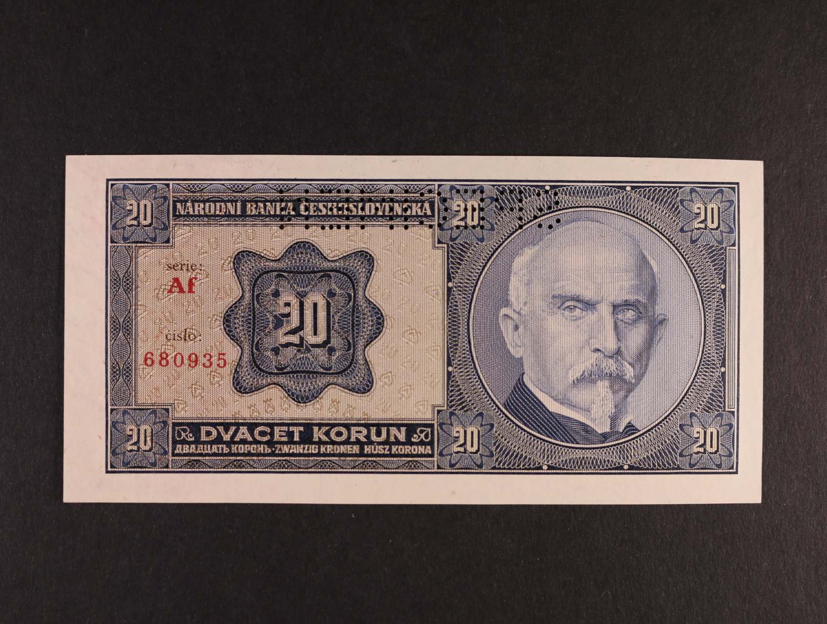 20 Kč 1.10.1926 sbírka sérií Af, Cg, Df, Dg, Fg, Ge, Gg, Gh, Hg, Chg, Ig, Jg, Lf, Qf, Sf, Sg, Tg, Uf, Xg, Ze, Zg vše perf. SPECIMEN, Ba. 21b2, Pi. 21a, celkem 21 ks, stav N, 1x 0/0