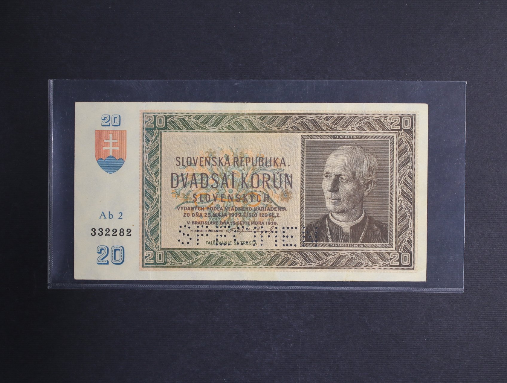 • 20 Ks 15.9.1939 série Ab 2 s perf. SPECIMEN, Ba. 47a, Pi. 5s, He. 47 a1S2