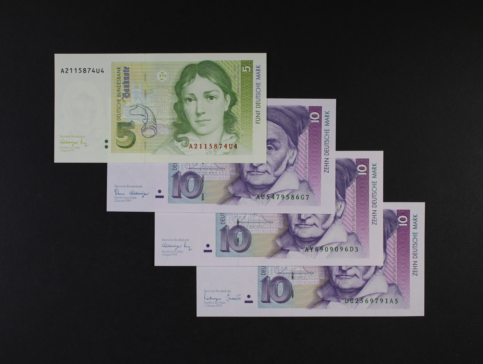 5 DM 1.8.1991 série A/U, 10 DM 2.1.1989 série AU/G, 10 DM 1.8.1991 série AY/D, 10 DM 1.10.1993 série DG/A, Ro. 296, 292, 297, 303, Pi. 37, 38a, 38b, 38c, Grab. BRD-37a, 36a, 41a, 47a, 4 kusy