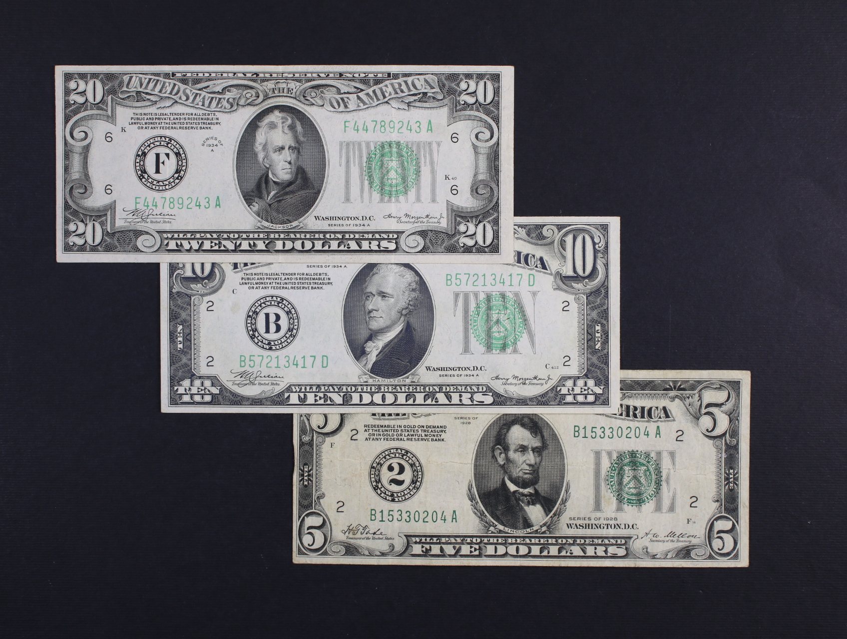 5 Dollars 1928 (2 New York / New York), 10 Dollars 1934 A (B New York / New York), 20 Dollars 1934 A (F Atlanta / Georgia) Federal Reserve Note, tmavěe zelené pečetě, Pi. 420, 430Da, 431Da, 3 kusy