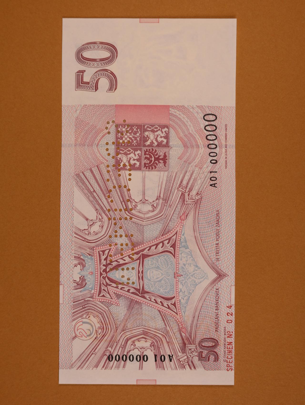 • 50 Kč 1993 série A01 000000 bankovní vzor - anulát s perforací SPECIMEN, přítisk SPECIMEN No. 024, nalepený na kartonu, Ba. CZ4