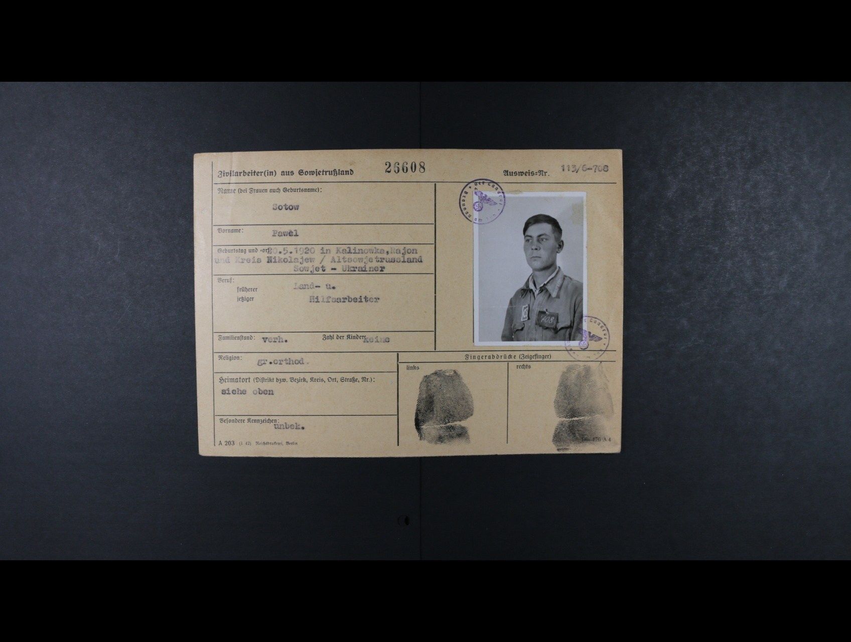 pracovní povolení na jméno Sotow Pawel, Sowjet-Ukrainer od 11.6.1942 do 3.7.44 jako pomocný dělník (VAW-RANSHOFEN, Gde Braunau), připsaná poznámka ze 3.7.1944 uprchl