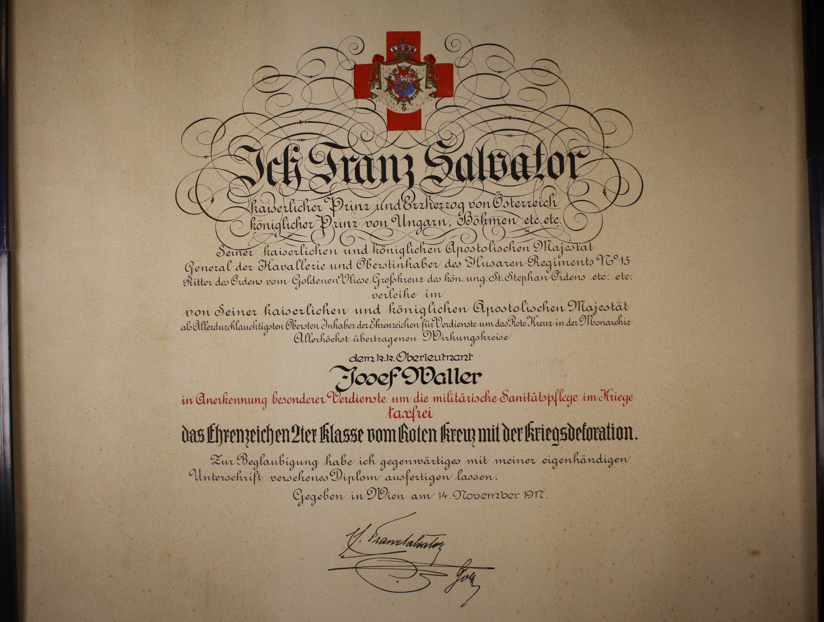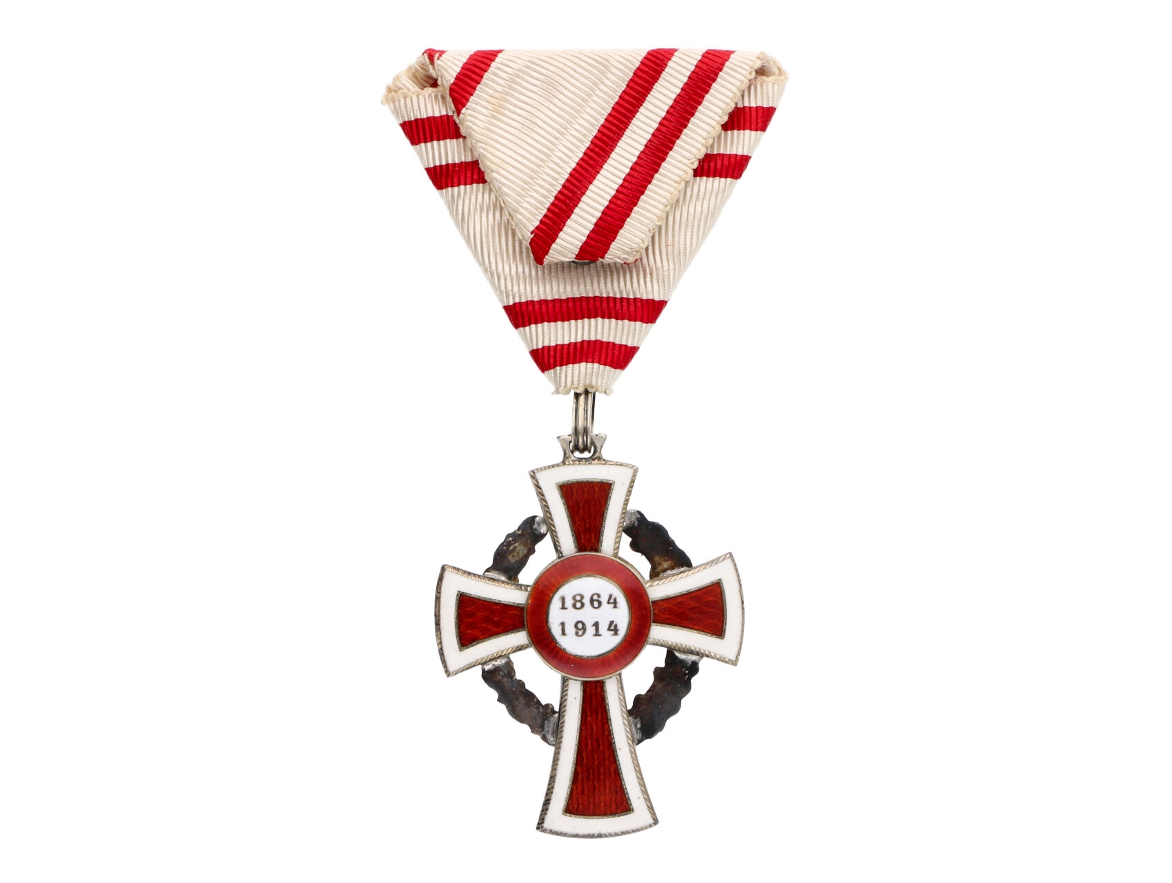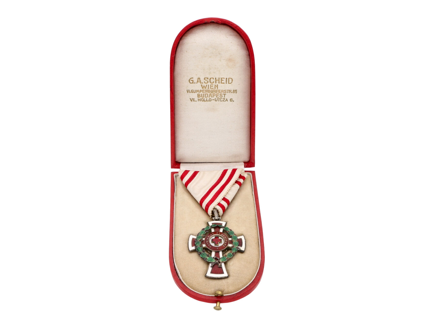 Čestné vyznamenání Za zásluhy o Červený Kříž s válečnou dekorací II. tř., na závěsném očku punc Ag a značka výrobce, (nečitelná) originální etue a dekret udělený 14. listopadu 1917, dekorativní, Marko 161a