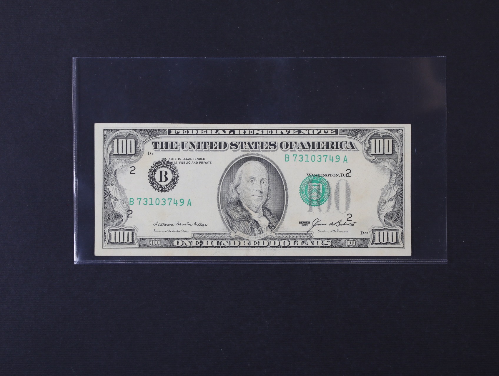 chybotisk, 100 Dollars 1985 (B New York / New York) s velkým posunem tisku pečetě "B" a číslovačů, Pi. 485