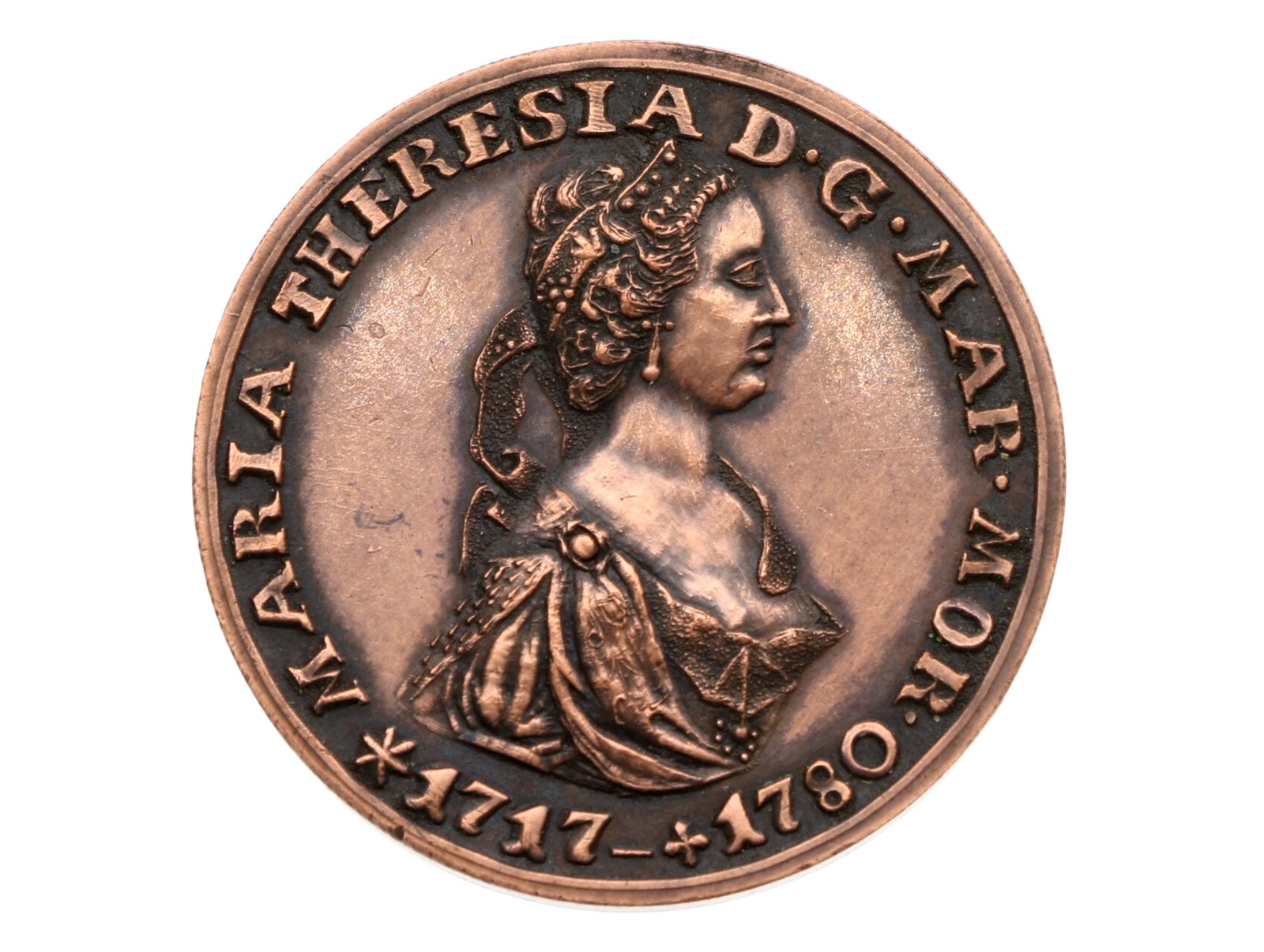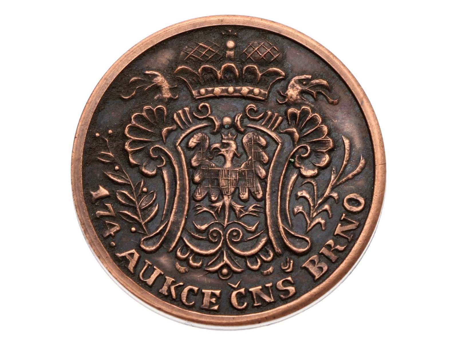ČNS - pobočka v Brně - AE medaile 174. aukce pobočky, 2017. Žeton připomíná 300. výročí narození Marie Terezie. Měď, 27,6 mm, 15,24 g., náklad 83 ks., signováno JJ (J.Jelínek), F.A2/91e