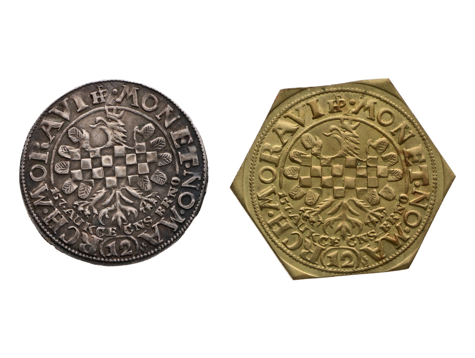 ČNS - pobočka v Brně - AR/AE medaile 157. aukce pobočky, 2009. Napodobenina dvanáctikrejcaru moravských stavů z r. 1619 brněnské mincovny. Stříbro 0.999, 28 mm, 2,62 g., náklad 122 ks., k tomu měď šestihran, 5,60 g., náklad 36 ks., signováno JJ (J. Jelínek), F.A2/67b,e, celkem 2 kusy