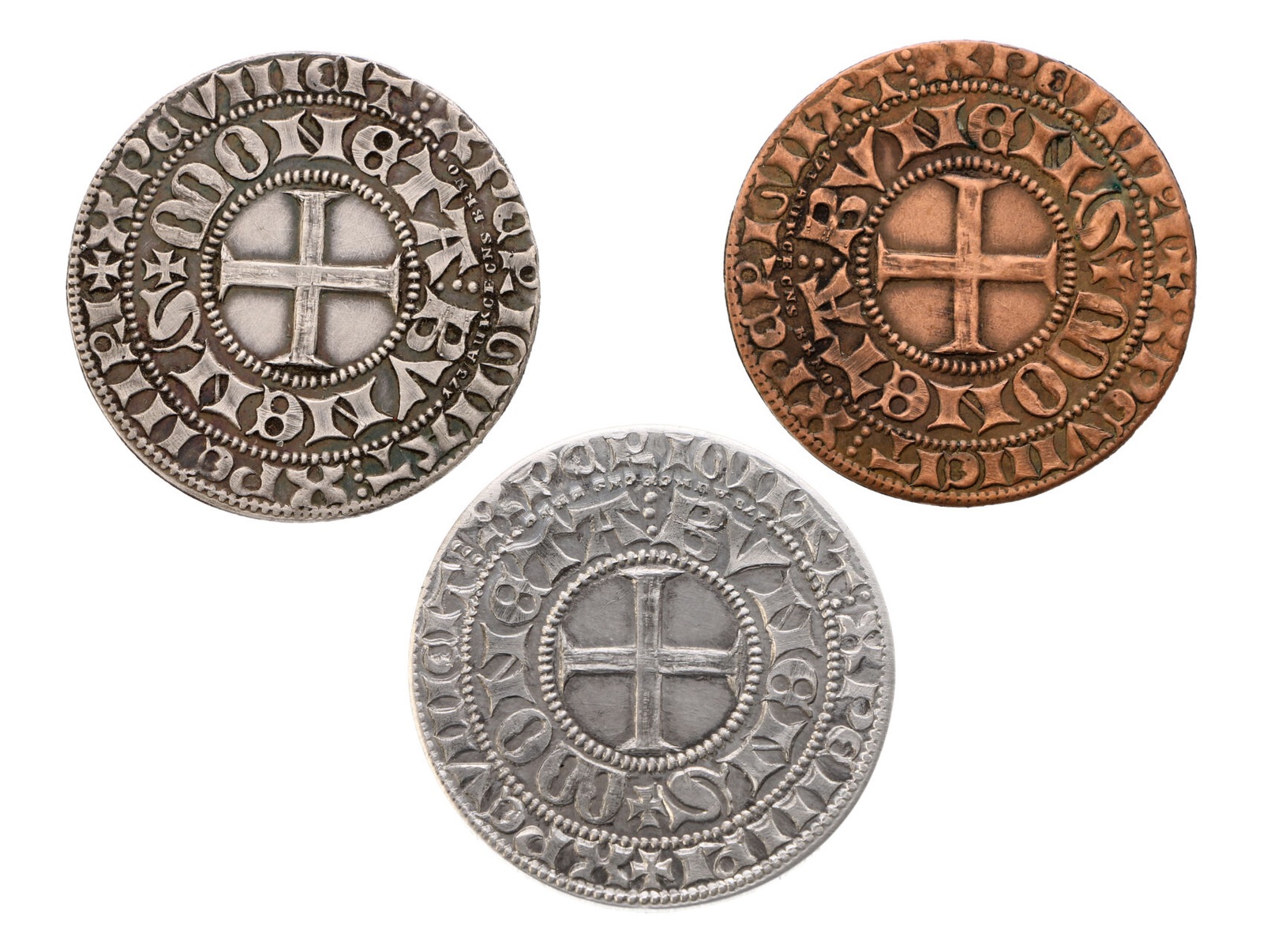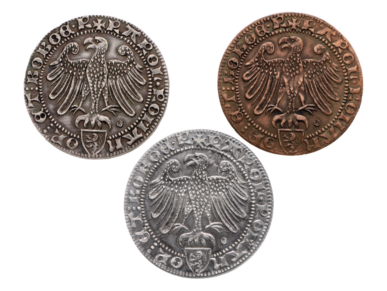 ČNS - pobočka v Brně - AR/AE medaile 173. aukce pobočky, 2017. Napodobenina groše Karla IV. ražený v Bonnu po korunovaci římským králem r. 1355. Stříbro 0.999, 28 mm, 3,31 g., náklad 89 ks., k tomu měď 2,73 g., náklad 63 ks. a hliník 2,99 g., náklad 35 ks., signováno JJ (J.Jelínek), F.A2/90c,d,e, celkem 3 kusy
