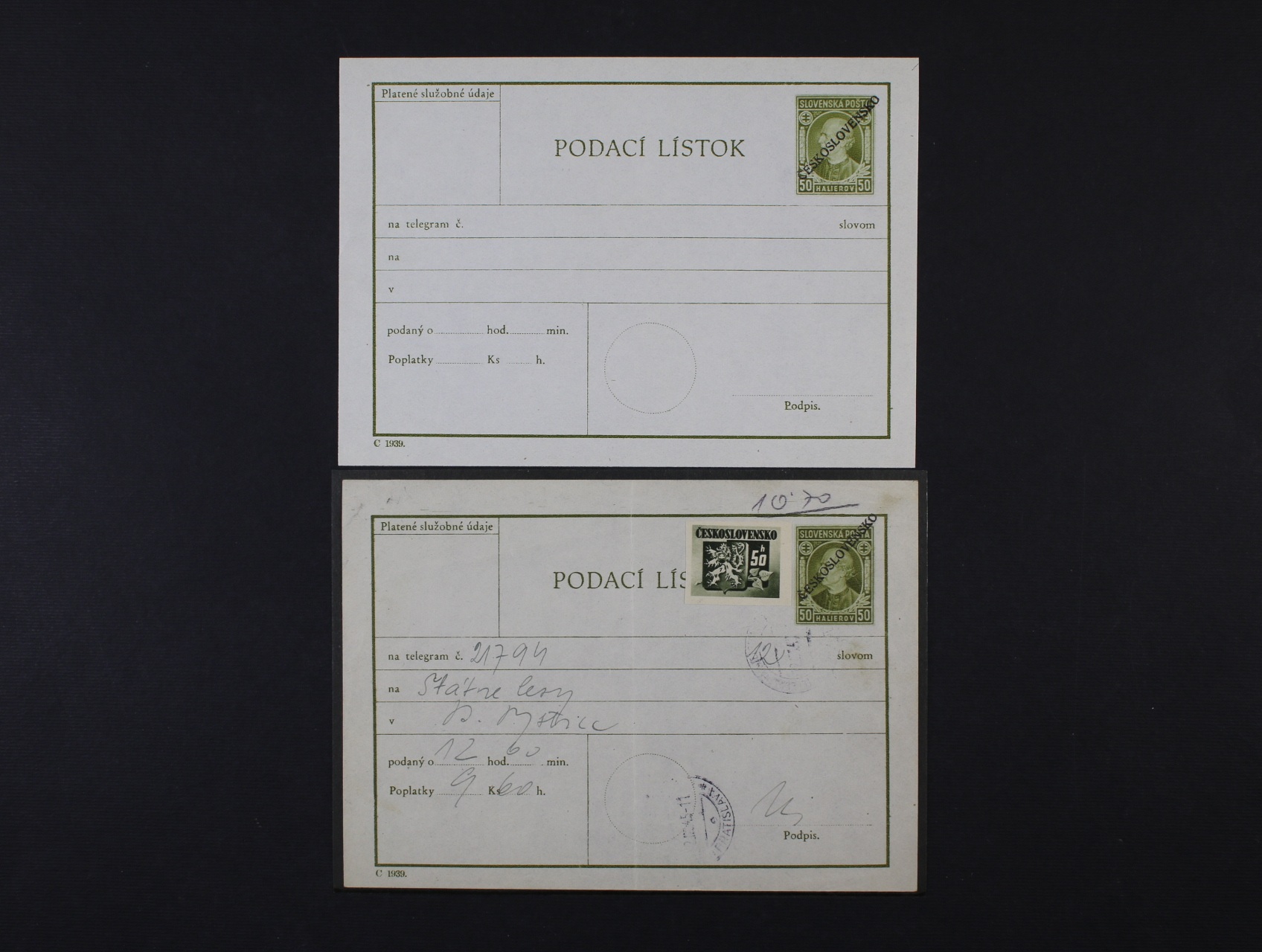 • CPL č. 5b nepoužitý + CPL 5 dofrank. zn. č. 363, pod. raz. BRATISLAVA 2.9.45