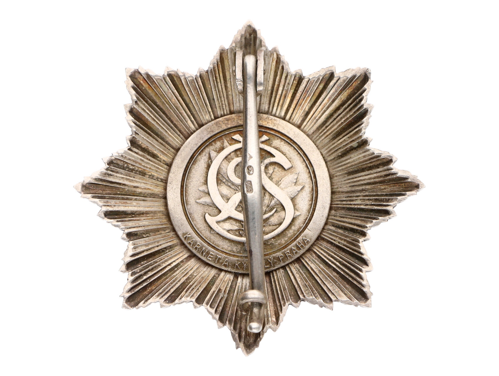 • ČS. vojenský Řád Bílého Lva Za vítězství II..stupeň, hvězda. Na upínací jehle punc Ag, ryzostní značka 900 a značka výrobce K.K. (Karnet a Kyselý Praha), mírně poškozený červený smalt pod lvíčkem. VM15, N22b