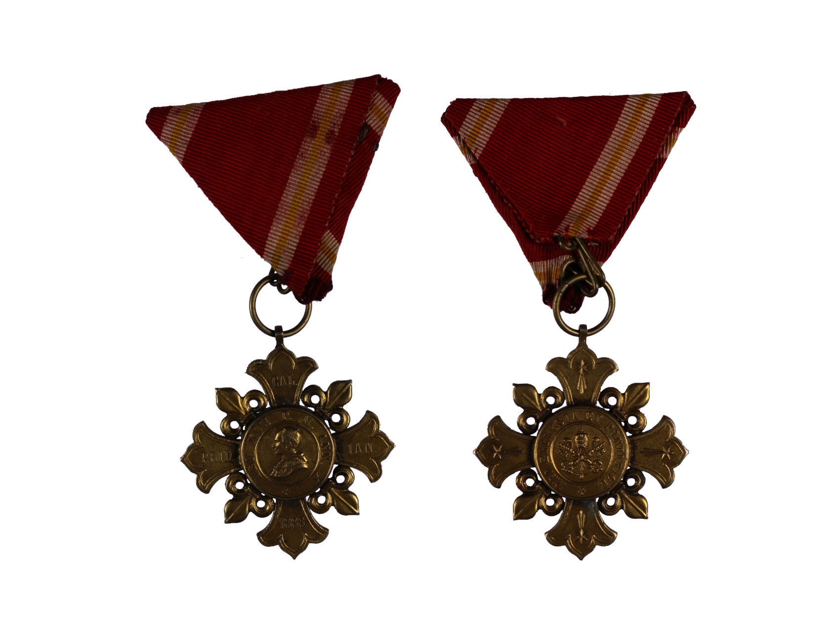 • Duchovní záslužný kříž Pro Ecclesia et Pontifice na původní trojúhelníkové stuze, zlacený bronz