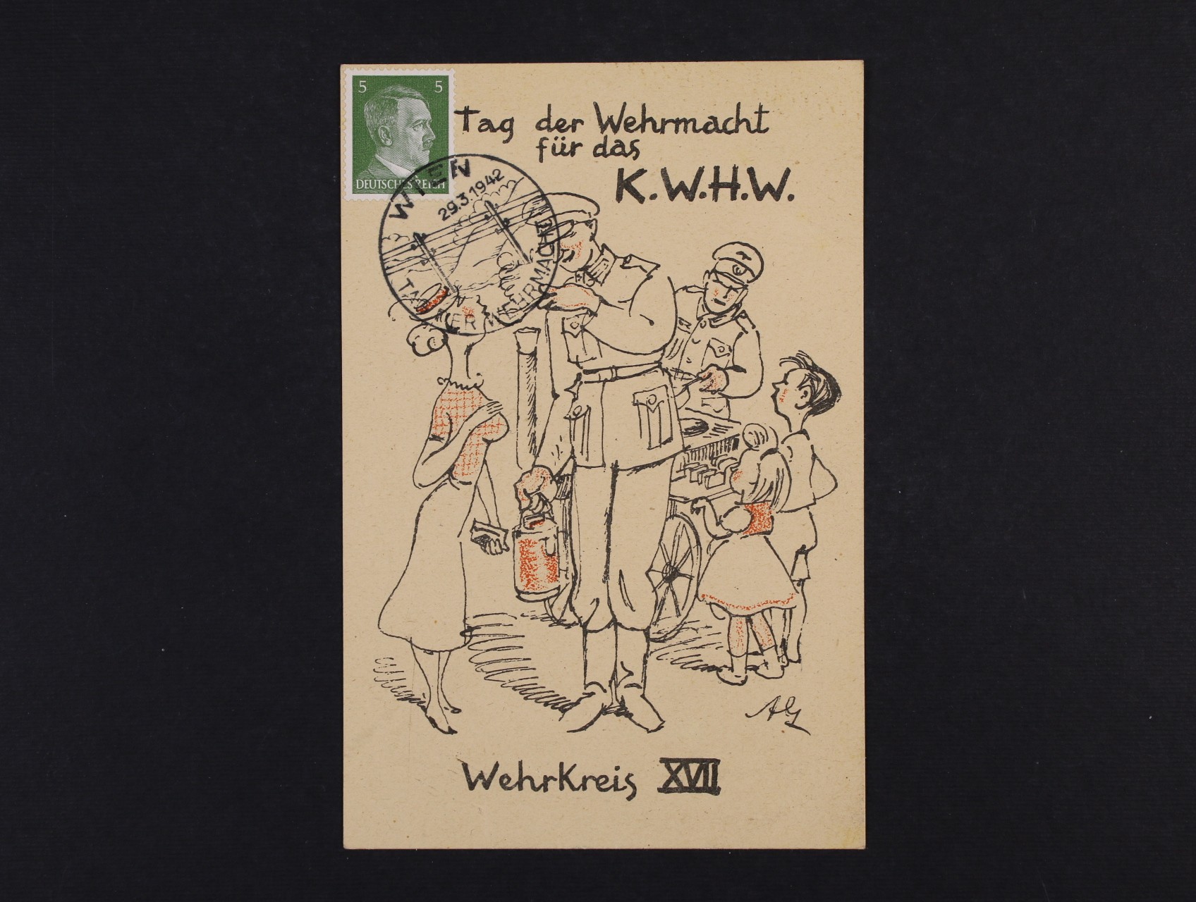 dvoubar. pohlednice Tag der Wehrmacht für das K.W.H.W. s vylepenou zn. a pam. raz.