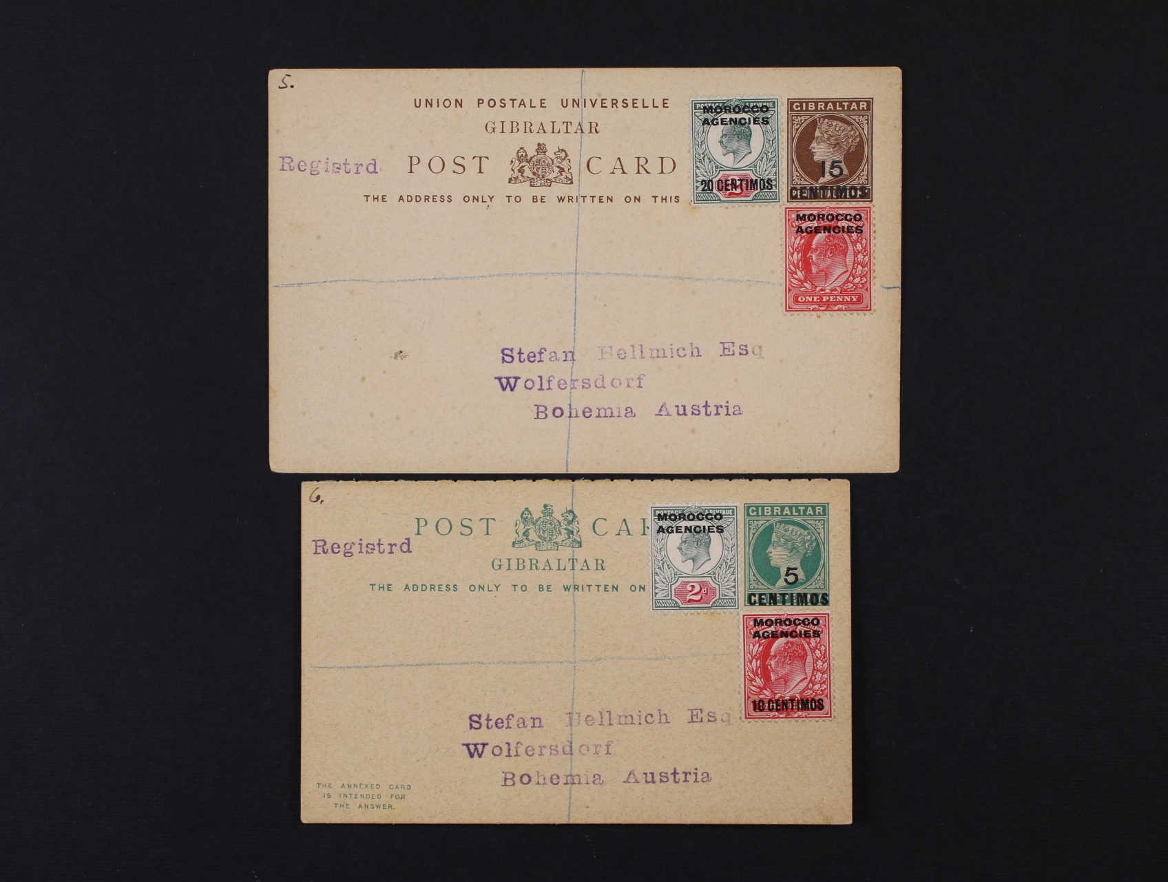 dvoudílná a jednodílná dopisnice do Rakouska dofrank. Britskými zn. s přetiskem MOROCCO AGENCIES bez pod. razítek, zajímavé