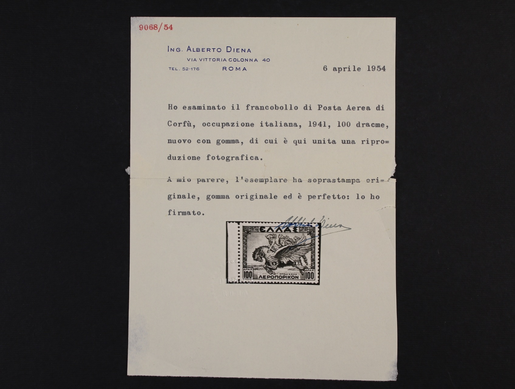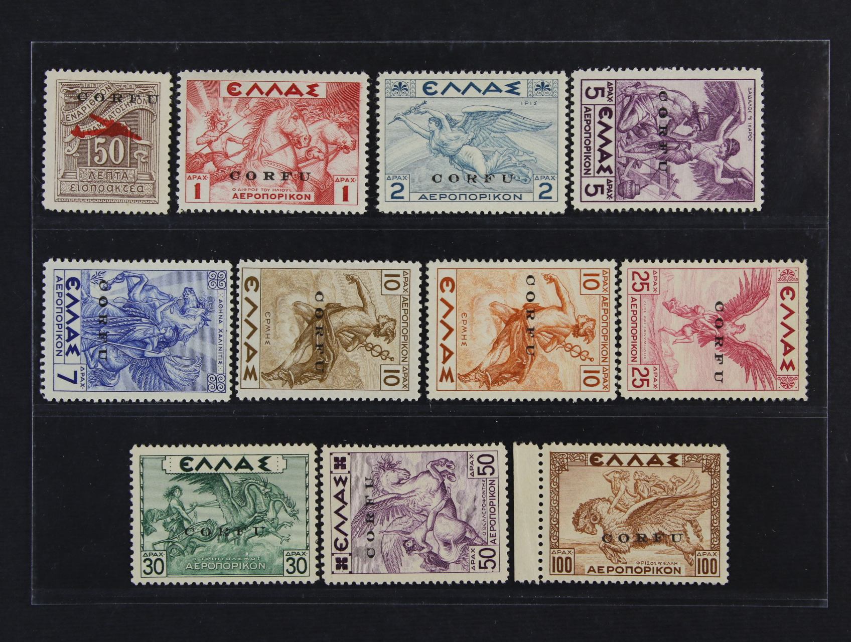 Egejské ostrovy – KORFU – italská okupace, letecké 1941, Sassone 1-11, přetisky na řeckých 50L-100Dr; luxusní kvalita, vícekrát zkoušeno, atest Diena, kat. 21000 EUR, unikátní nabídka!