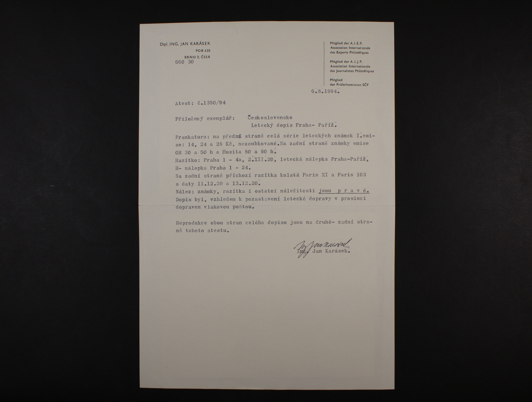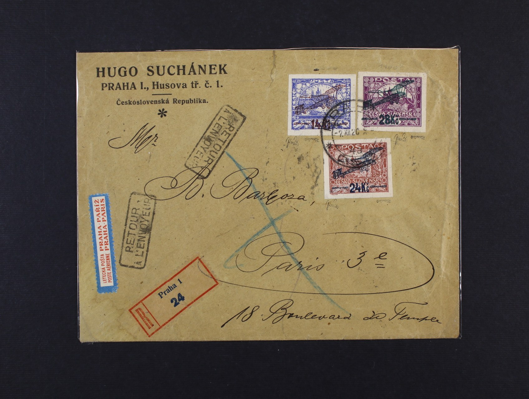 firemní let. R-dopis do Paříže frank. zn. L č. 1 - L 3, na zadní str. dofrank. zn. č. 153, 155, 162 - 3, pod. raz. PRAHA 1 2.12.20, průch. a přích. raz. PARIS 11.12.20 12.12.20, dopis byl v důsledku pozastavení let. dopravy přepraven vlak. poštou, zajímavé, atest Karásek