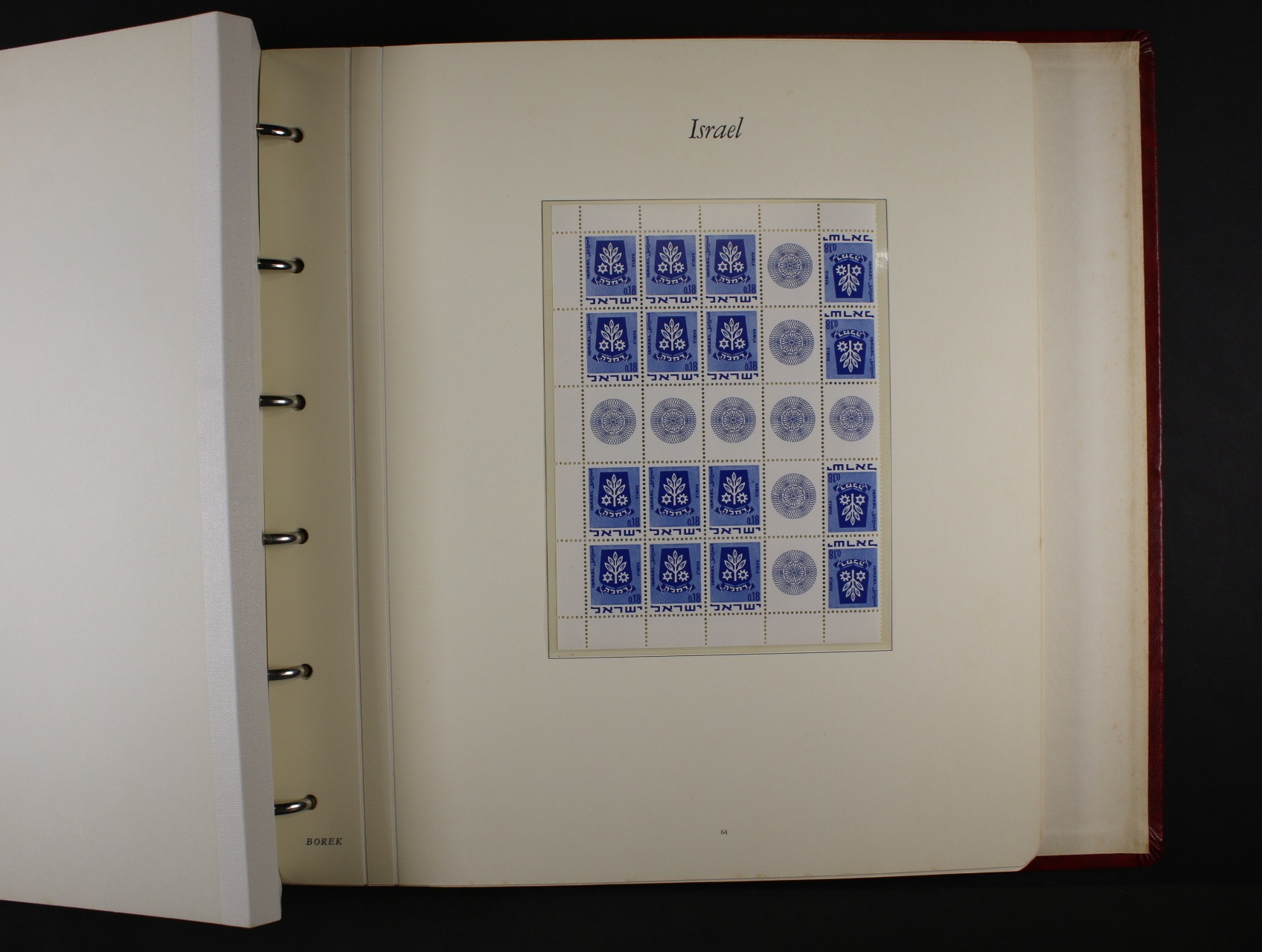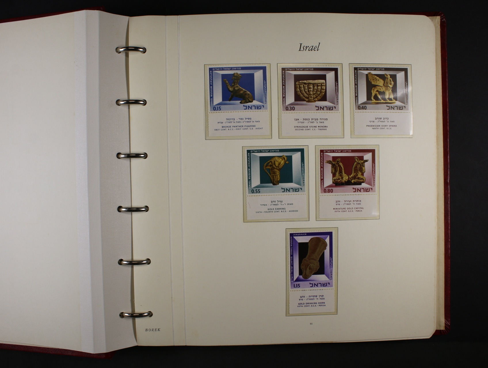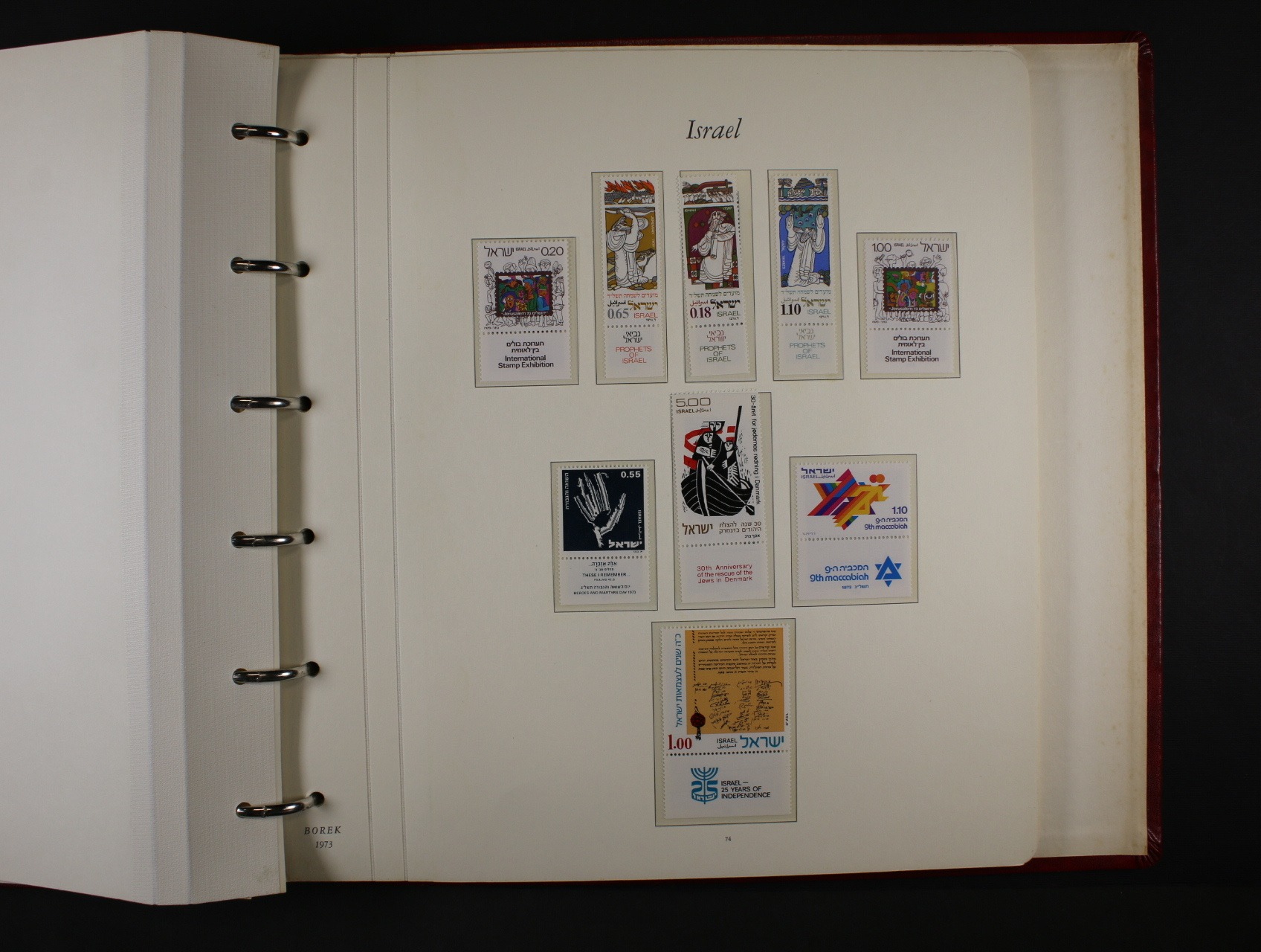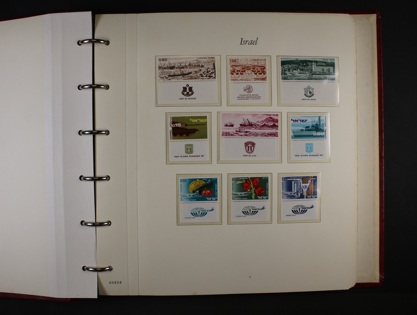 Israel - nekompl. sbírka zn. převážně s taby, z let 1965 - 1980, vše uloženo na zasklených listech Borek v luxusních červených mechanických deskách, kat. cena více jak 300 EUR