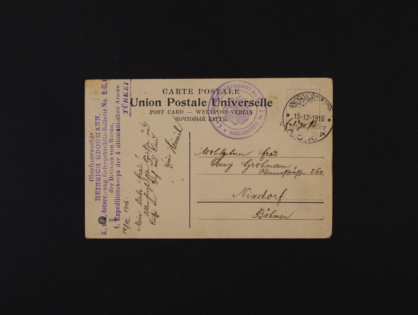 • jednobar. pohlednice Jerusalema s pod. raz. FELDPOST MIL. MISS. A.O.K. 4 15.12.1916 + kulaté útvar. fialové raz. HAUBITZBATTERIE No. 2, zajímavé, dobrá kvalita