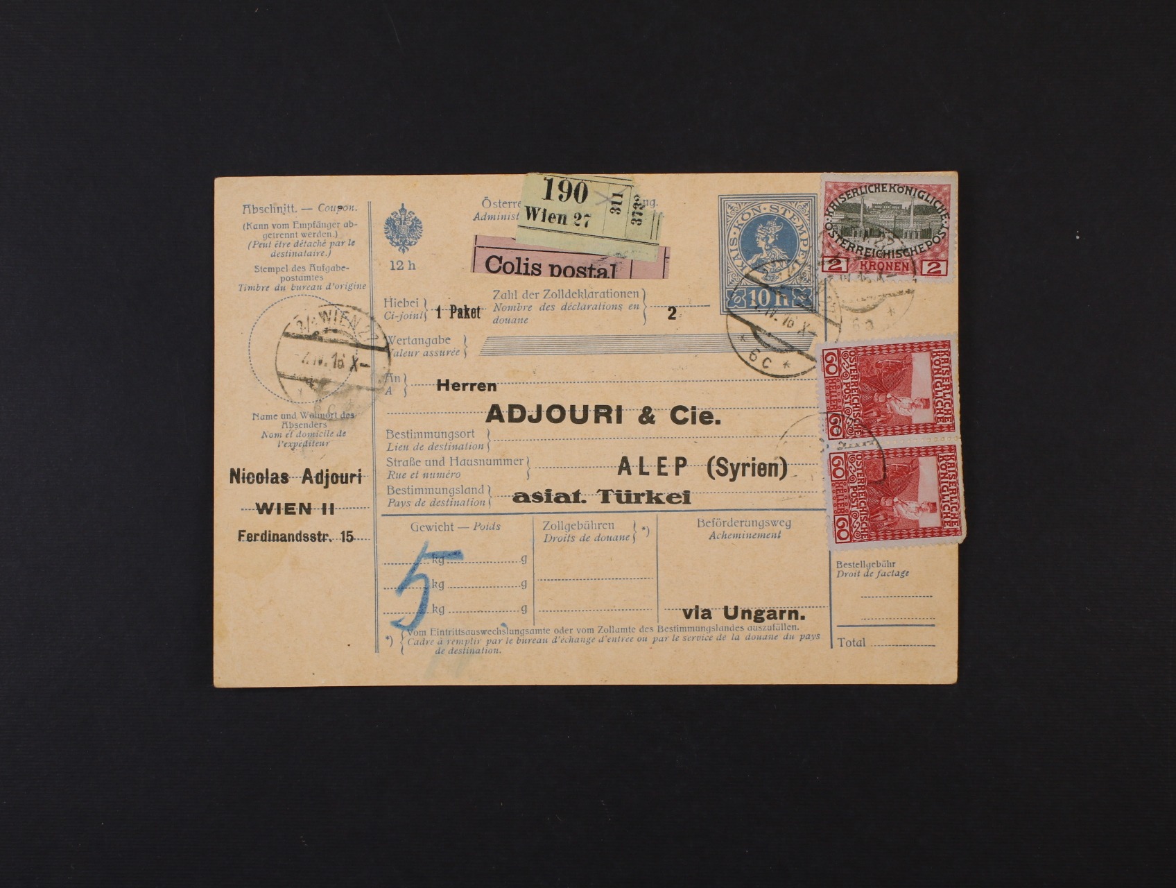kompl. pošt. průvodka do Sýrie frank. zn. Mi. č. 151 ve vodorovné dvoupásce a zn. Mi. 154, pod. raz. WIEN 22 4.6.16, na zadní str. dofrank. tureckou zn., přích. raz. HALEP, zajímavé