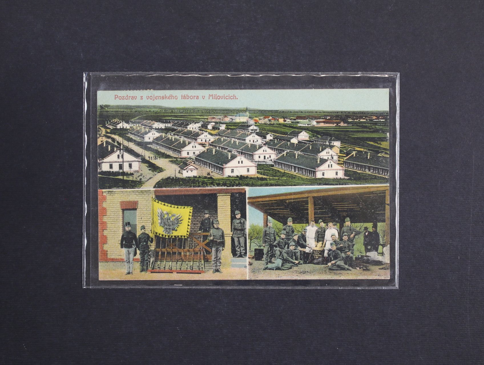 • Milovice, okr. Nymburk - bar. litograf. koláž Pozdrav z voj. tábora v Milovicích, použitá 1915, lux. kvalita