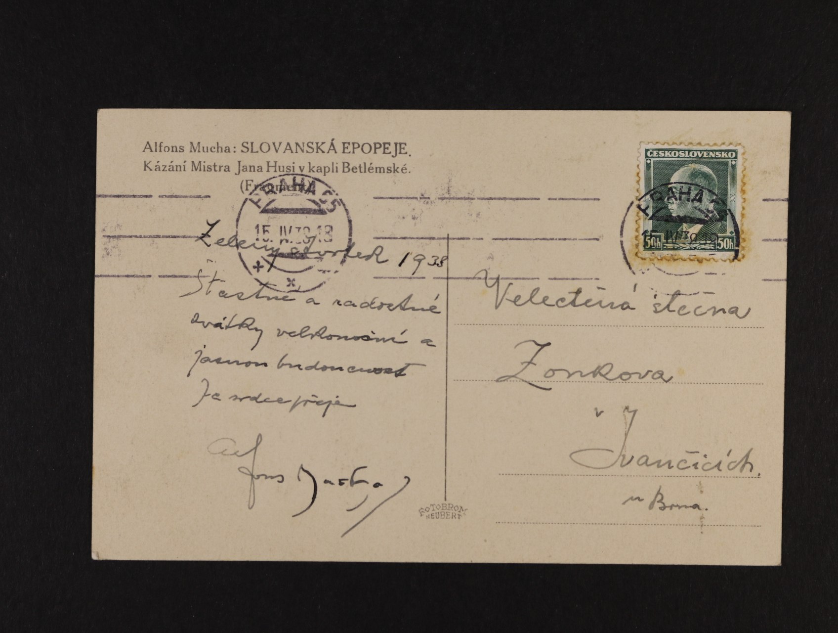 • Mucha Alfons - pohlednice Slovanská epopej, kázání mistra Jana Husi v kapli Betlémské s vlastnoručně psaným přáním a podpisem