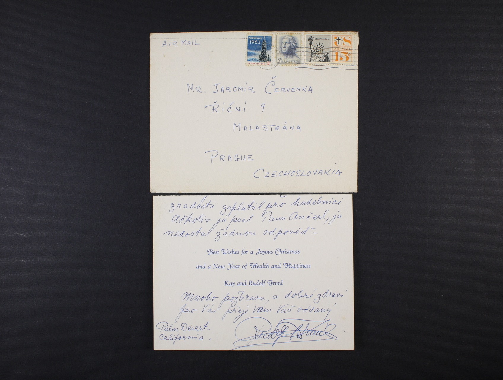 Osobnosti - Friml Rudolf, 1879 -1972 - americký pianista a hudební skladatel českého původu - osobní přání k vánoců a Novému roku z r. 1912 s poděkováním a vlastnoručním podpisem vč. obálky z USA