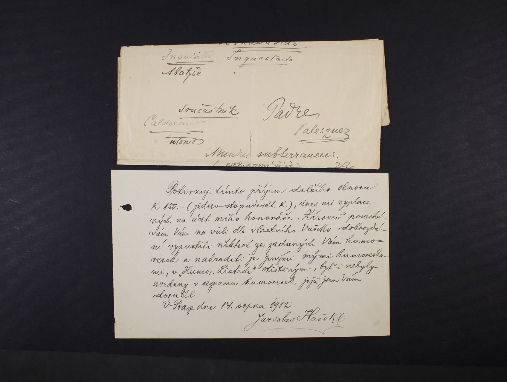 Osobnosti - Hašek Jaroslav, 1883 - 1923 - spisovatel, publicista a novinář - ručně psané potvrzení o příjmu honoráře 150 K ze 14. srpna 1912 s vlastnoručním podpisem + jeden list s vlastnoručně psanými poznámkami