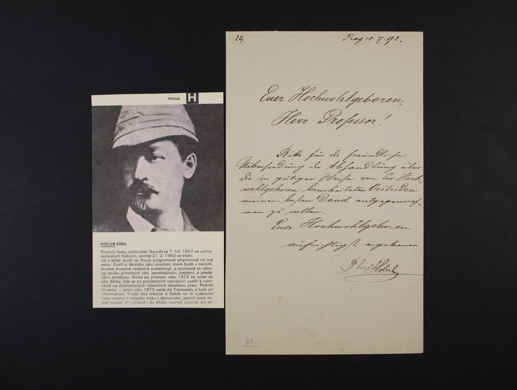 Osobnosti - Holub Dr. Emil, 1847 -1902 - význačný český cestovatel, lékař a dobrodruh - vlastnoručně psaný dopis z r. 1892 s podpisem