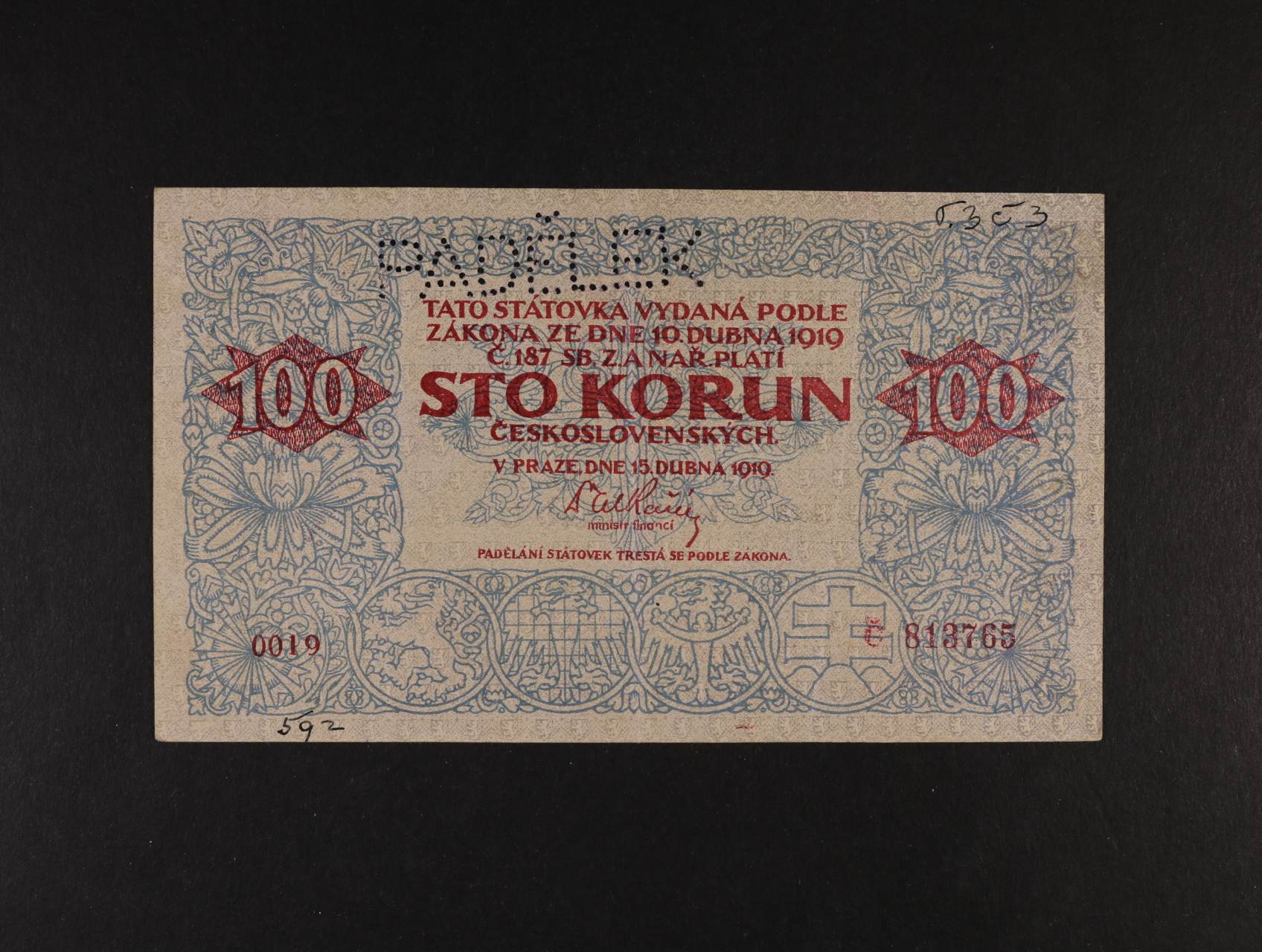 • padělek, 100 Kč 15.4.1919 série 0019, dobový tištěný zachycený padělek typu 3 č. 3, perf. PADĚLEK