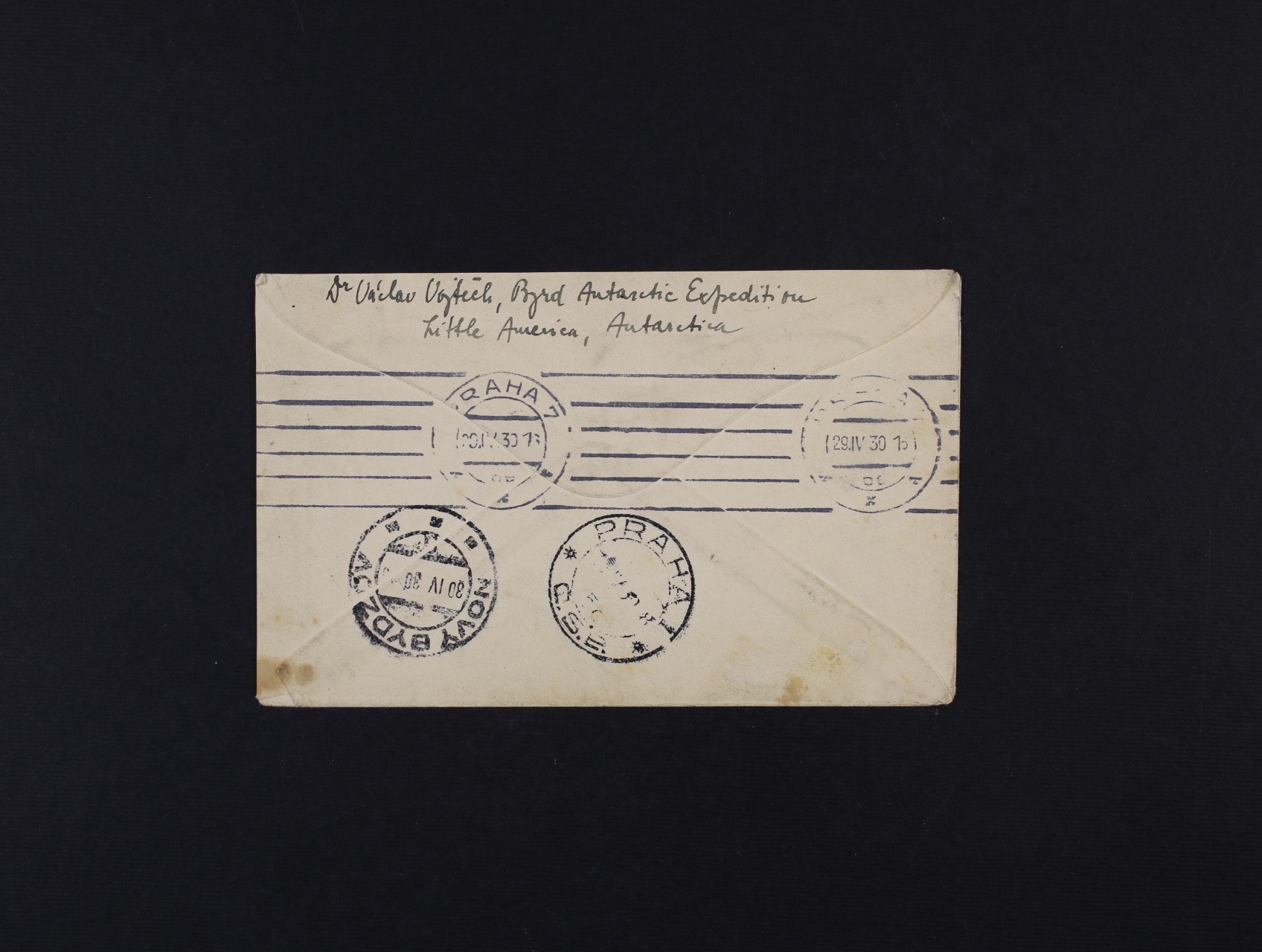 Polární výpravy - Byrdova výprava zřídila operační základnu ve Velrybí zátoce a pojmenovala ji MALÁ AMERIKA ("LITTLE AMERICA"), účastníkem této výpravy byl i první čech v Antarktidě Dr. Václav Vojtěch - originální obálka výpravy zaslaná do Čech Václavem Vojtěchem, frank. zn. 5c s raz. S.S.CITY OF NEW YORK 19.FEB.1930 + kašet BYRD ATLANTIC EXPEDITION + průch. a přích. raz., velmi zajímavé, vzácné