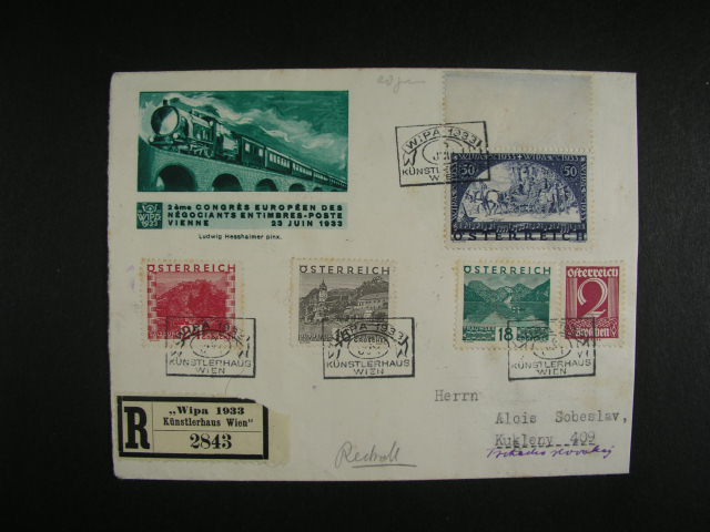 • R-celistvost do CSR frank. mj. zn. Mi. c. 555 A s pod. ramec. raz. WIPA 1933, na zadni strane jako zalepky pouzite novotisky zn. Merkur WIPA 1933