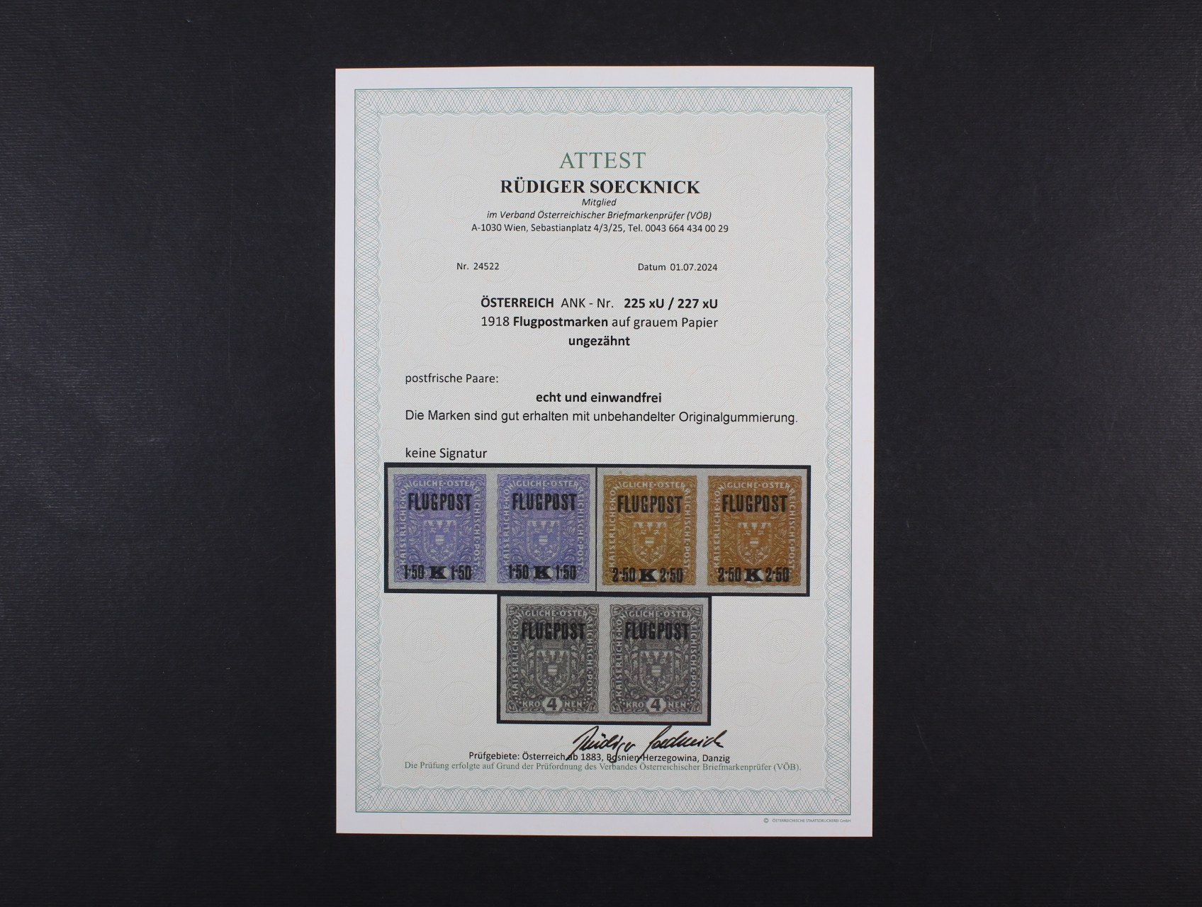rak. zn. Mi. č. 225x U - 227x U ve vodorovných dvoupáskách na bílém papíře s lepem, (zn. Mi. 226 ST přetisku), lux. kvalita, atest Rüdiger Soecknick, kat. cena 54000 Kč