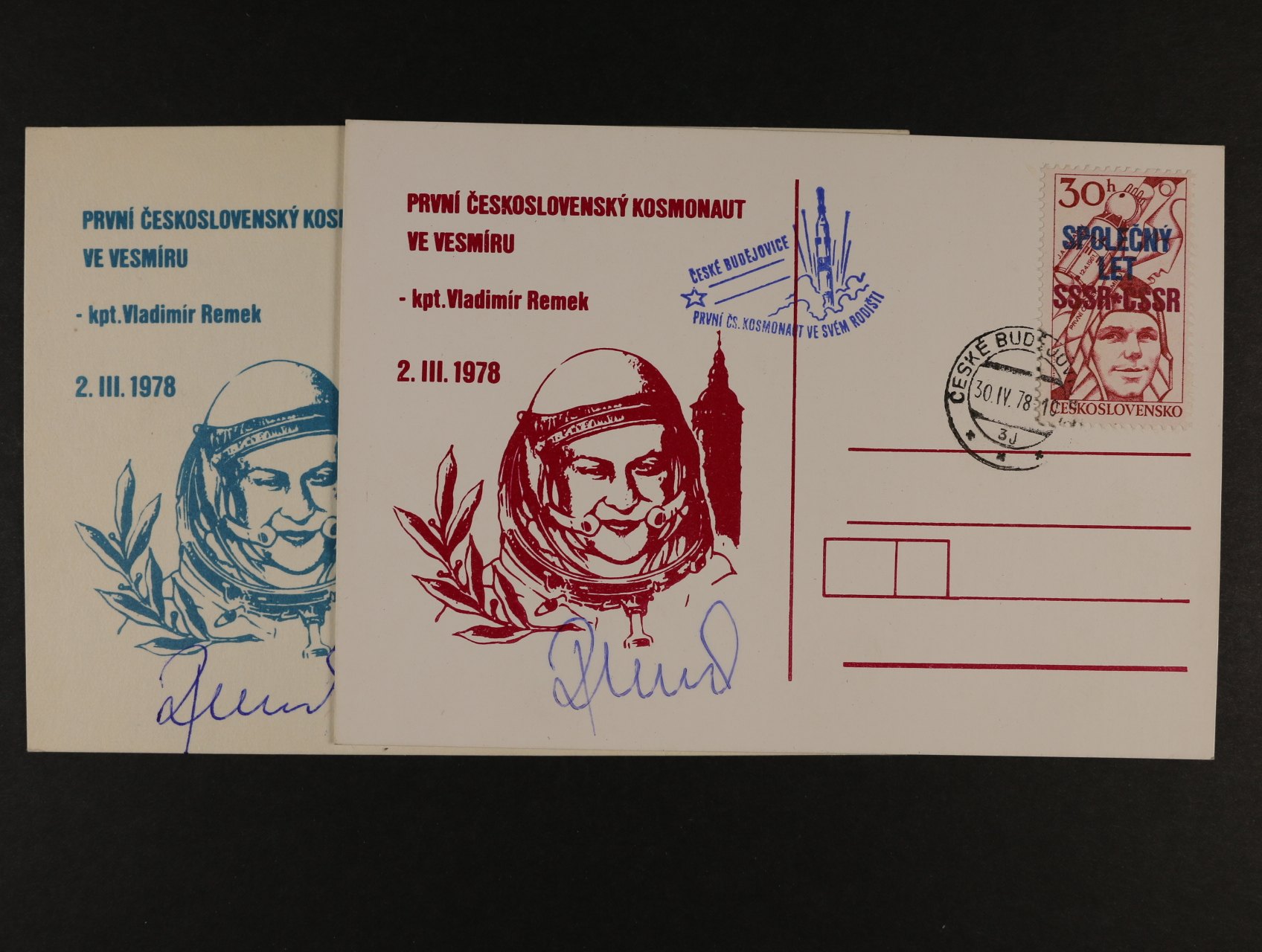 • Remek Vladimír - dva KL s přítiskem v modré a červené barvě PRVNÍ ČESKOSLOVENSKÝ KOSMONAUT VE VESMÍRU s razítky a vlastnoručním podpisem
