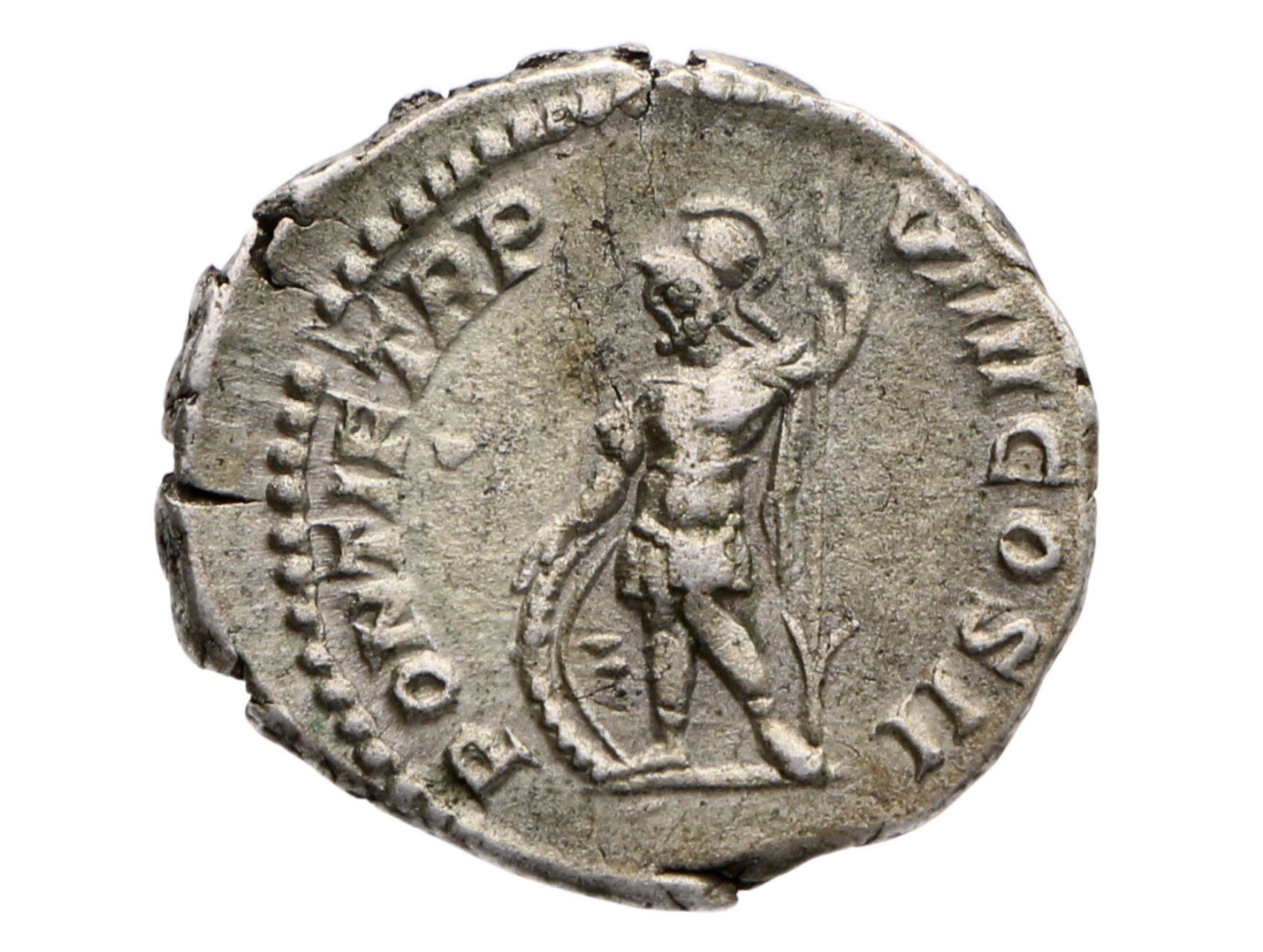 Řím císařství, Caracalla jako Augustus 198-217 - AR-Denár. Ověnčená hlava panovníka zprava, ANTONINVS PIVS AVG / vlevo stojící Mars, držící štít a kopí, PONTIF TRP VIII COS II. 2.73 g. RIC 83f, KAMP 51.102