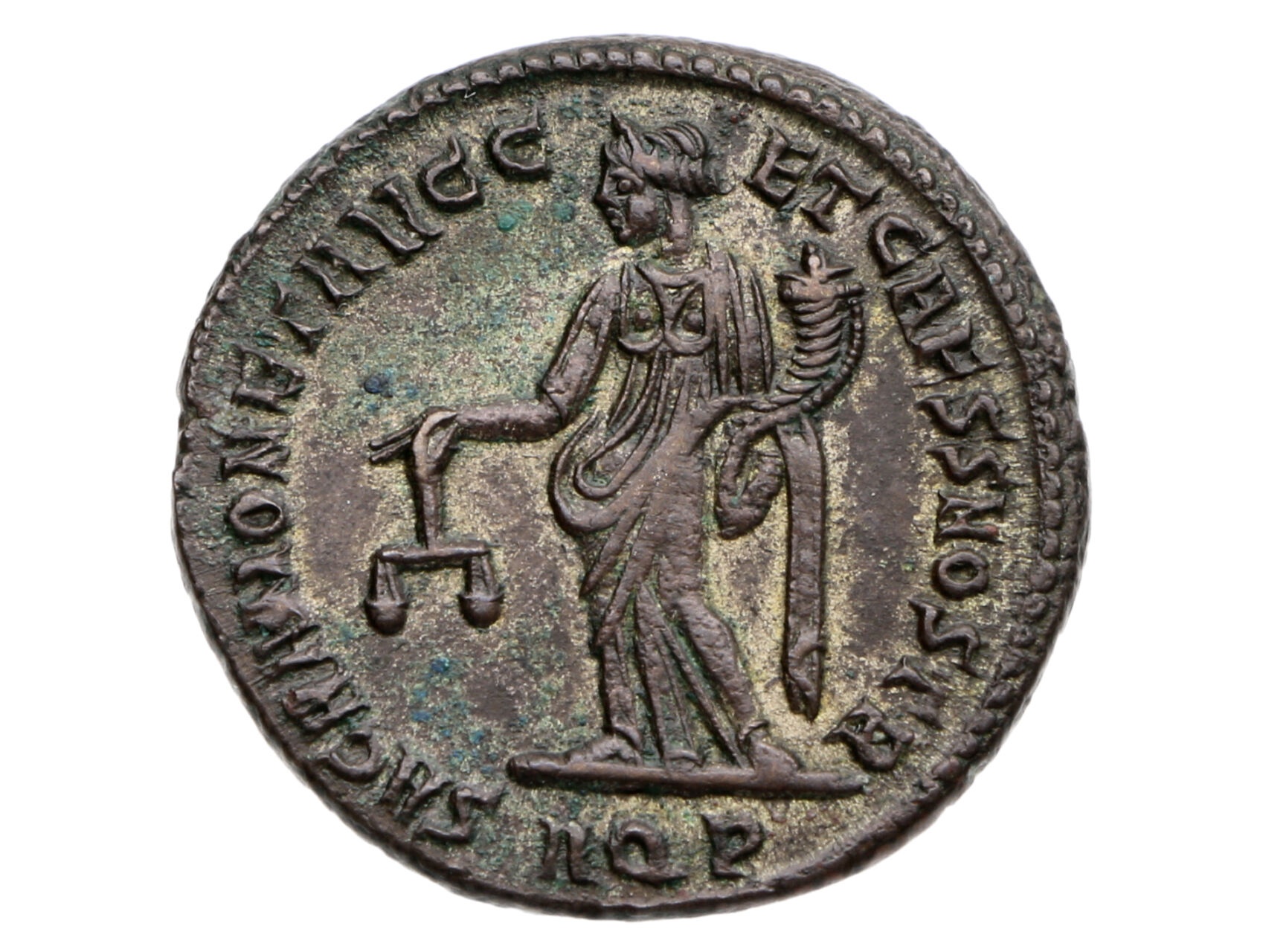 • Řím císařství, Diocletianus 284-305 - Nummi/Follis. Ověnčená hlava panovníka vpravo, IMP DIOCLETIANVS PF AVG / Stojící Moneta vlevo, držící váhy a roh hojnosti, SACRA MONET AVGG ET CAESS NOSTRA. 9.31 g. KAMP 119.89