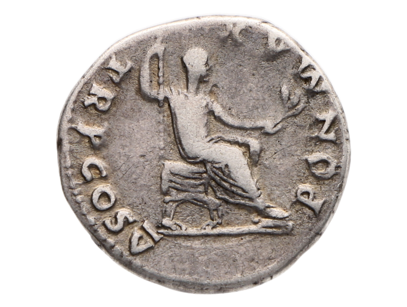 Řím císařství, Vespasianus 69-79 - AR Denár. Ověnčená hlava panovníka vpravo, IMP CAESAR VESPASIANVS AVG / Vespasianus s žezlem a ratolestí sedící vpravo, PON MAX TR P COS V. 3,28 g, RIC 683f, KAMP 20.56