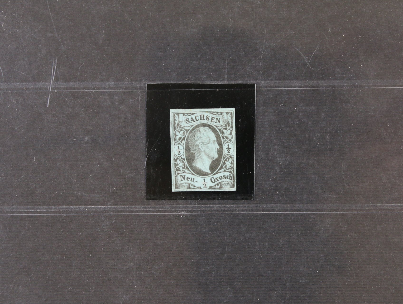 Sasko 1851 - zn. Mi. č. 3F, Fridrich August II. 1/2Gr FEHLDRUCK (chybotisk) v modré barvě namísto šedé, , tzv. „Modrý král“ - bezvadný exemplář této rarity světové úrovně, atesty Grobe a Pfenninger; kat. 20000 EUR, pochází ze sbírky hraběte von FERRARY rozprodávaná v aukci M.G.Gilbert Paříž 1923, 6. aukce, los. č. 552, jeden z nejkvalitnějších známých kusů