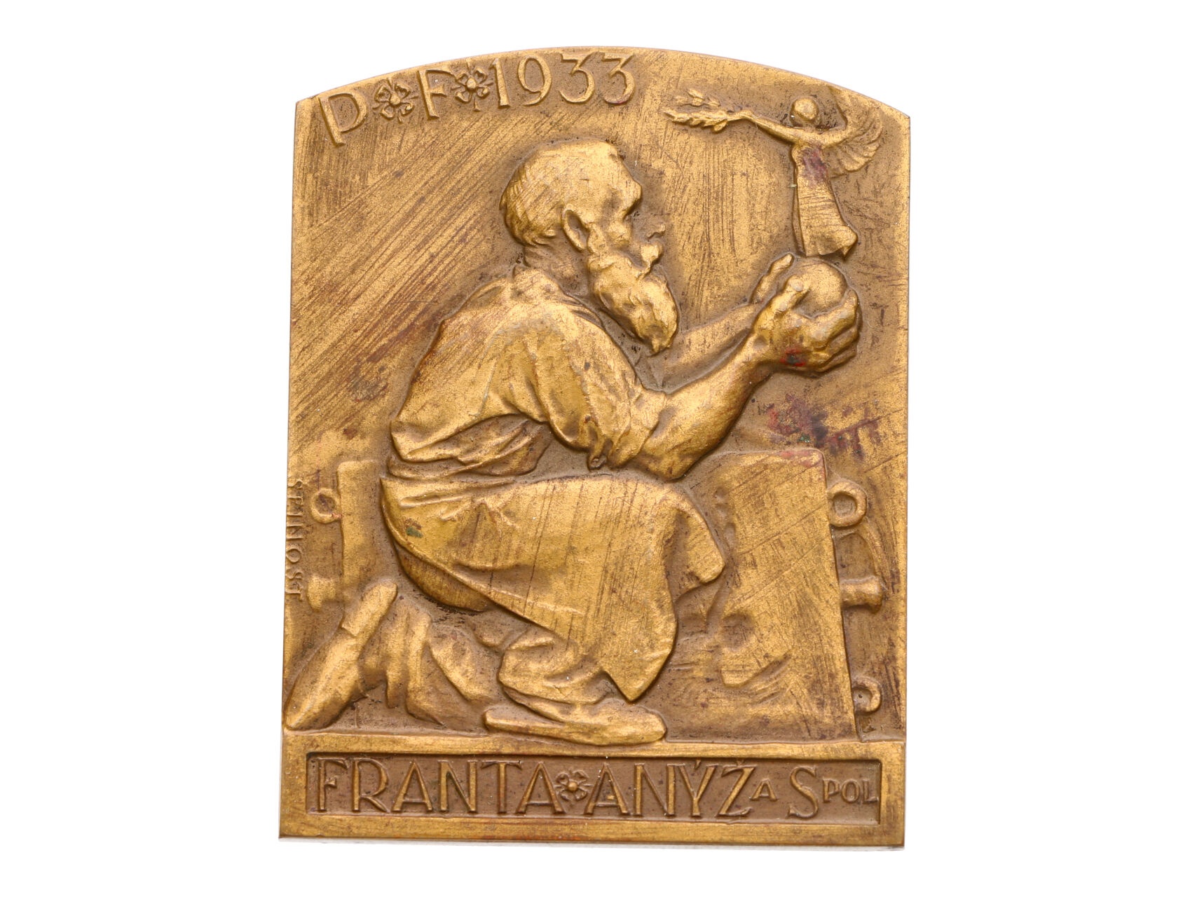 Šejnost Josef 1878-1941 - jednostranná plaketa, PF Franta Anýž 1933. Sedící slévač drží sošku bohyně Niké, text. Bronz 57x45 mm, signováno, Bo-002