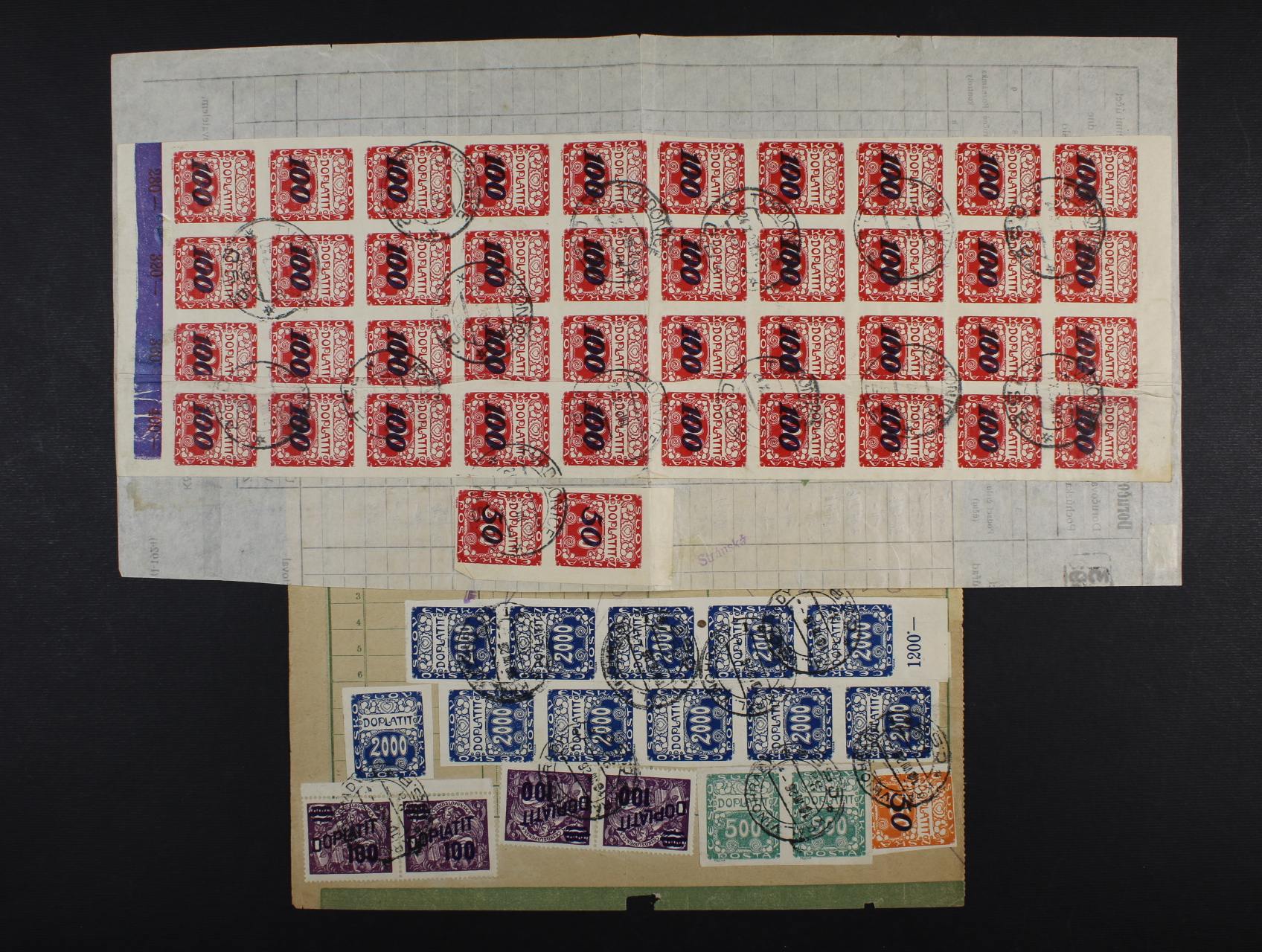 • sestava 4 ks formulářů Doručovka poštovních poukázek vyplacenými vysokými smíšenými a násobnými frankaturami dopl. zn. emisí 1919, 1922, 1924, 1926, zajímavé