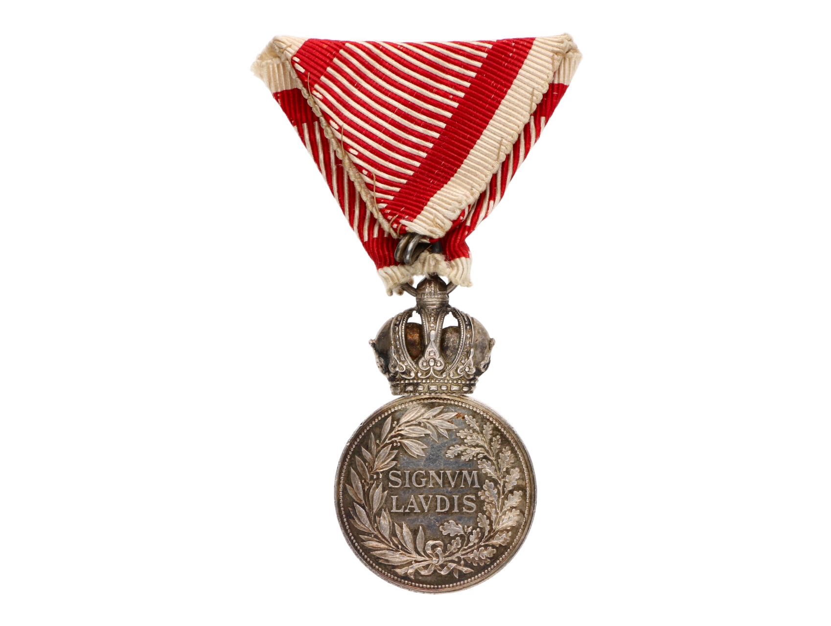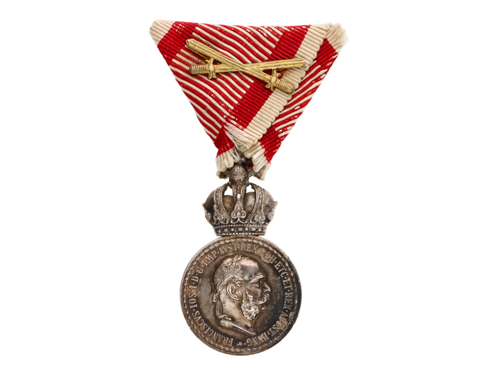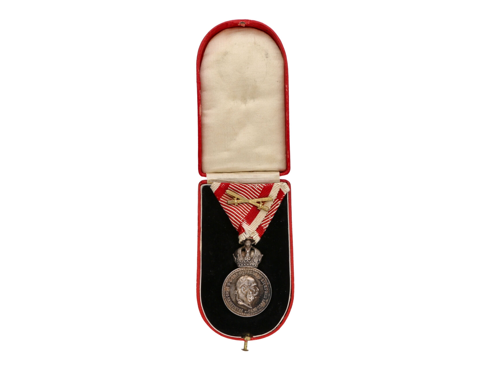 Stříbrná vojenská záslužná medaile Signum Laudis F.J.I., na hraně značka hl. punc. úřadu Vídeň "A", na závěsném kroužku punc Ag a značka výrobce JZ (Josef Zimbler), původní vojenská stuha s meči a originální etue, Marko146a