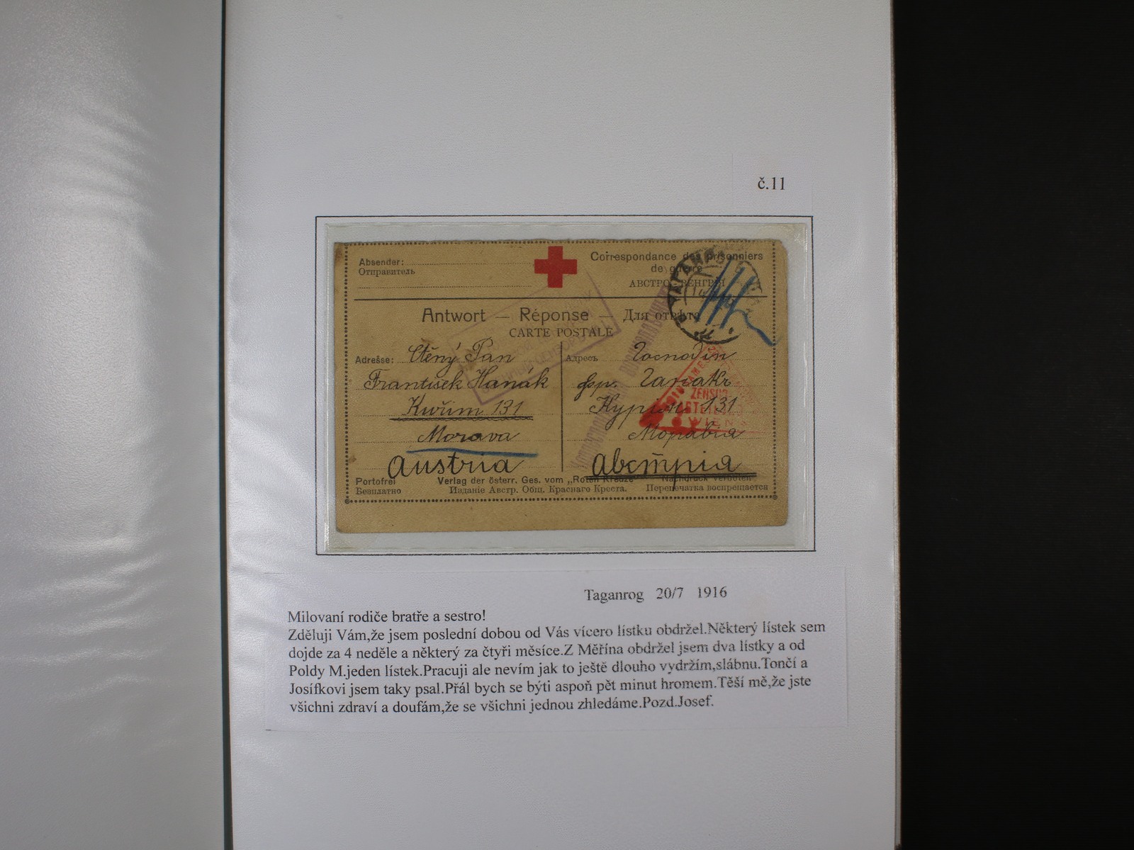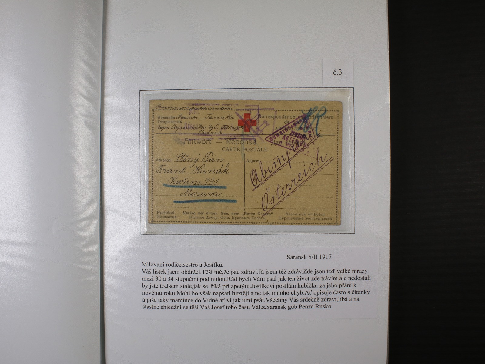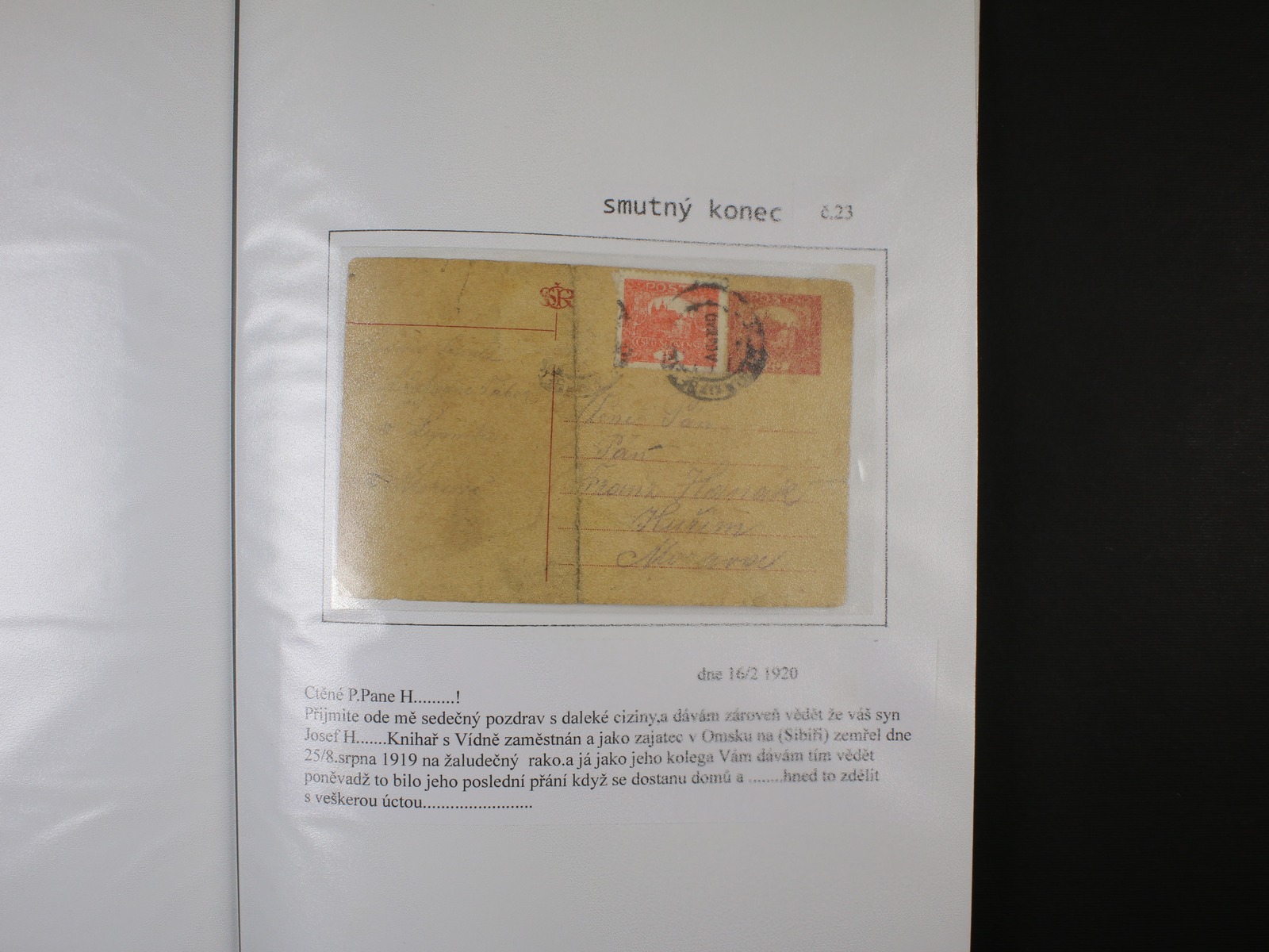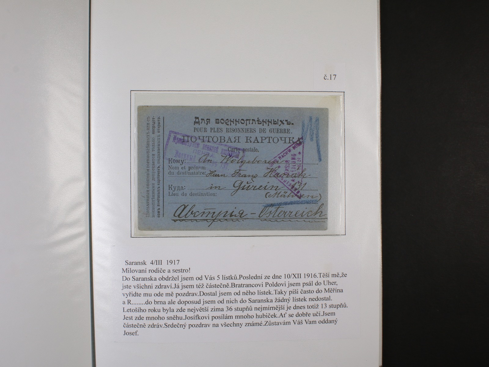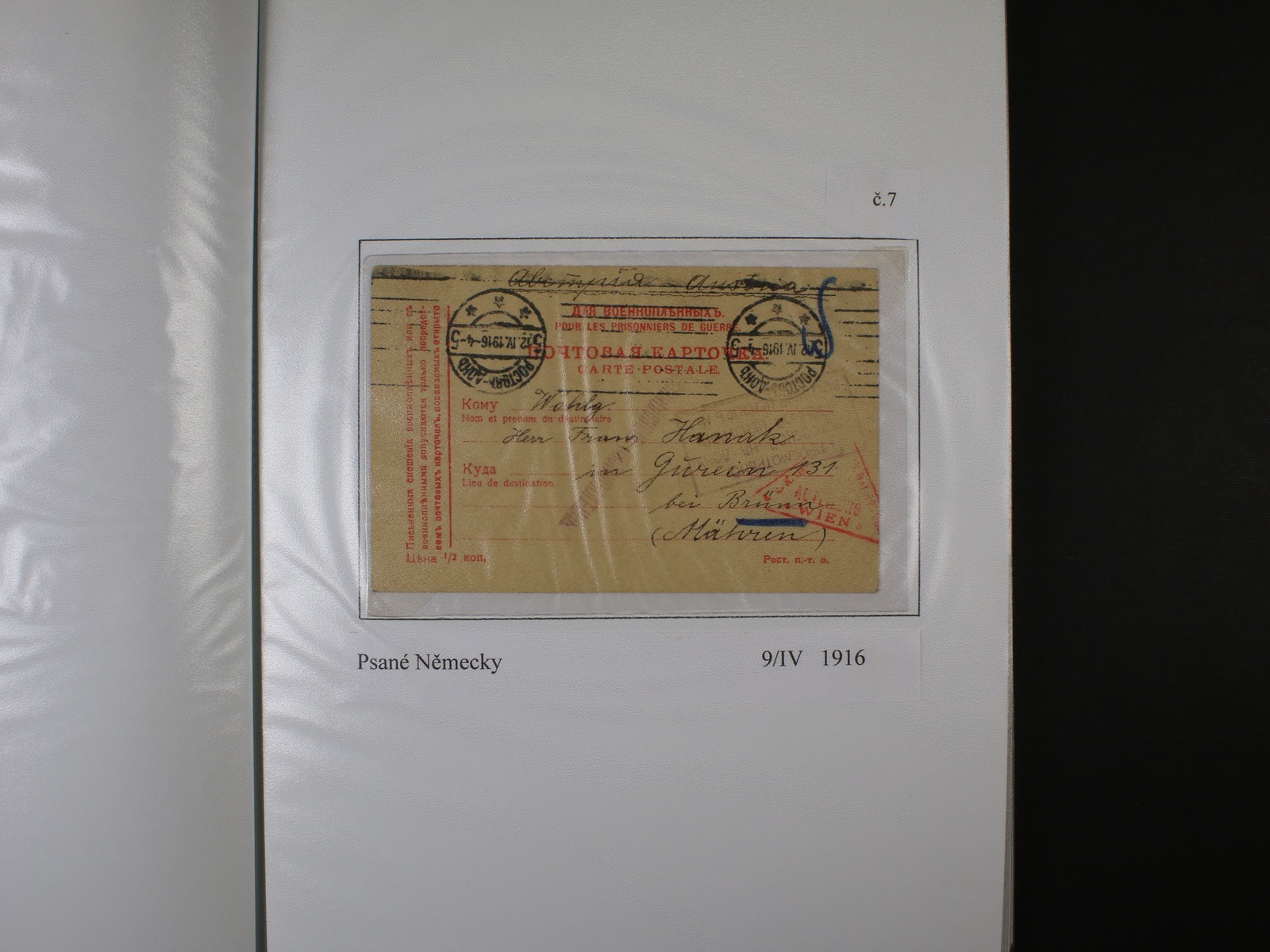 zajatecká pošta čs. vojáků z období 1. svět. války z let 1915 - 17 - sestava 25 ks celistvostí, zajímavá raz., cenzury, uloženo na listech s popisem v šedých šroubových deskách, zajímavé, k prohlédnutí
