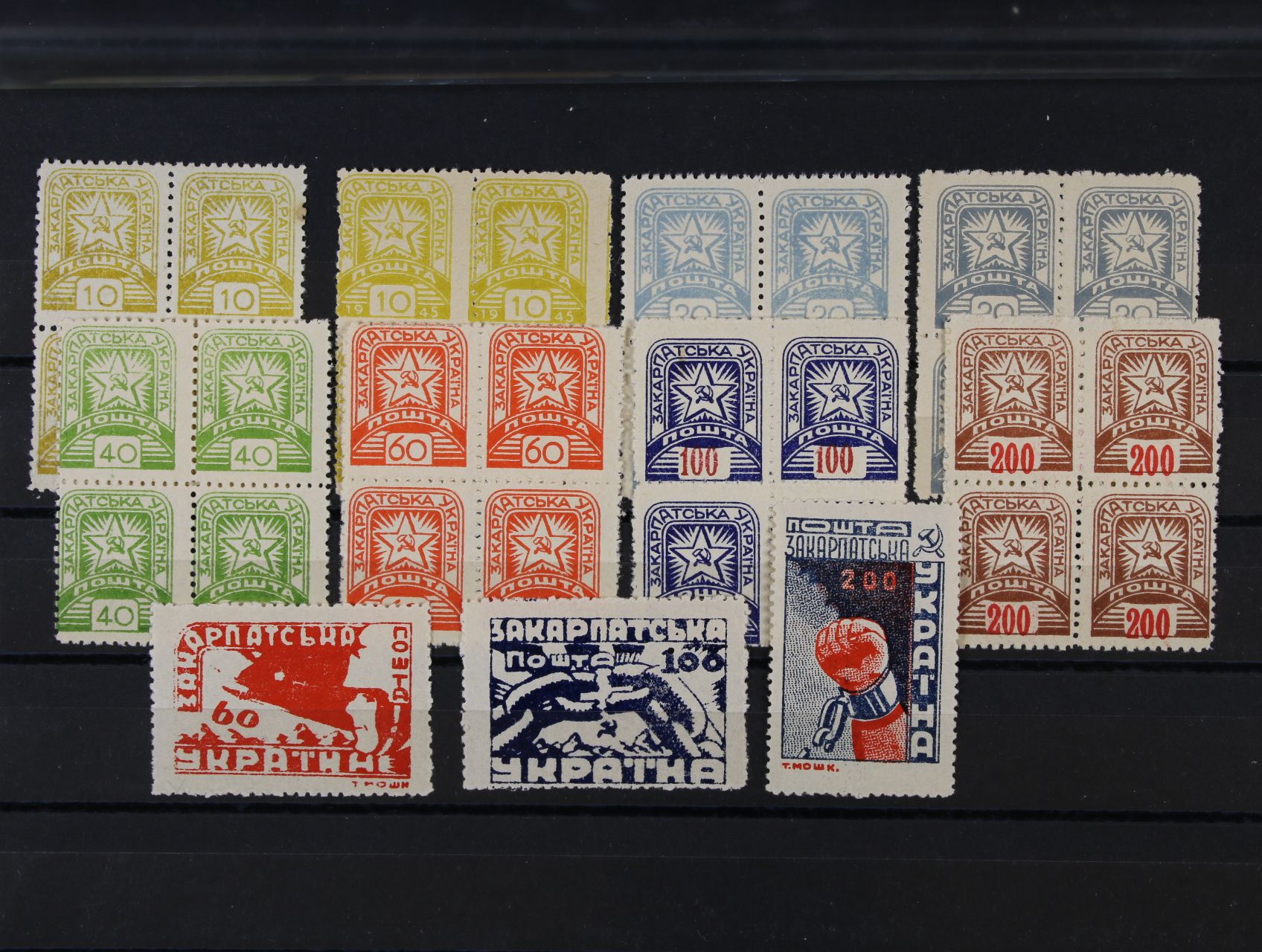 • Zakarpatská Ukrajina - zn. Mi. 78 - 80a a 81 - 88 ve čtyřblocích, běžné výrobní vady a vynechávky lepu, kat. cena min. 900 EUR