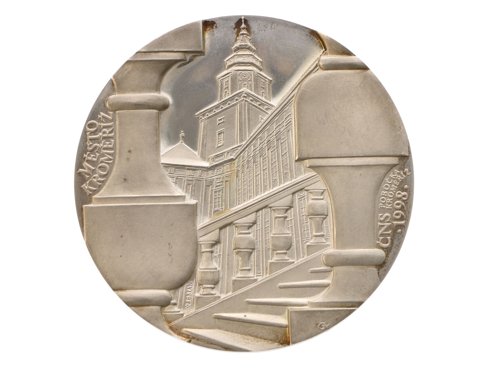 Zeman Karel 1949 - AR medaile 1998, 150. výročí Kroměřížského sněmu. Hlava personifikace svobody pootočená vlevo, po obvodu 12 znaků zemí zúčastněných na sněmu, opis / Pohled na budovu kroměřížského zámku průhledem přes balustrádu schodiště, opis vlevo a vpravo. Stříbro 50 mm, 80 g, Ag 900/1000, raženo 500 ks, KZ111