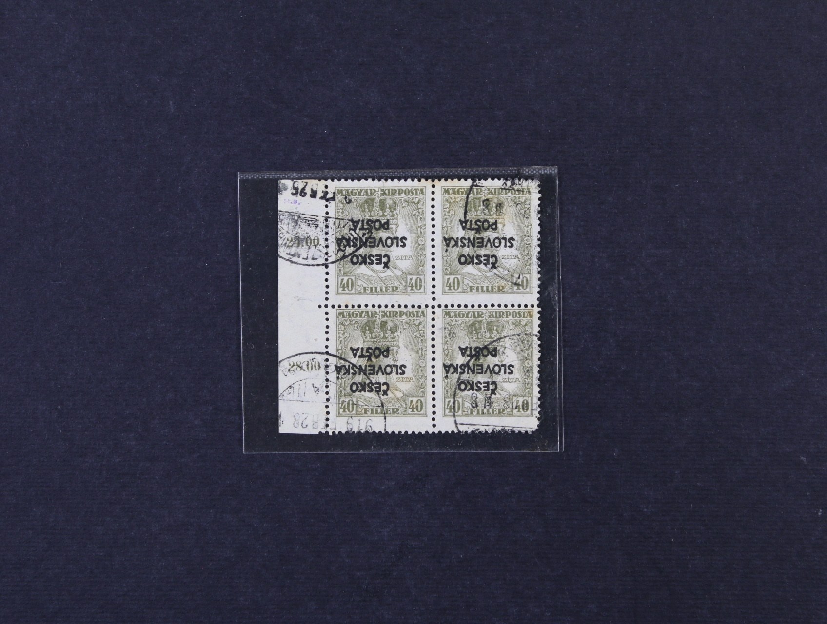 Žilinské vydání - zn. RV č. 150, převrácený přetisk, ve čtyřbloku s levým okrajem a raz. Turčianský Sv. Martin 28.Feb.1919, zk. Ondráček, kat. cena cca 4000 Kč