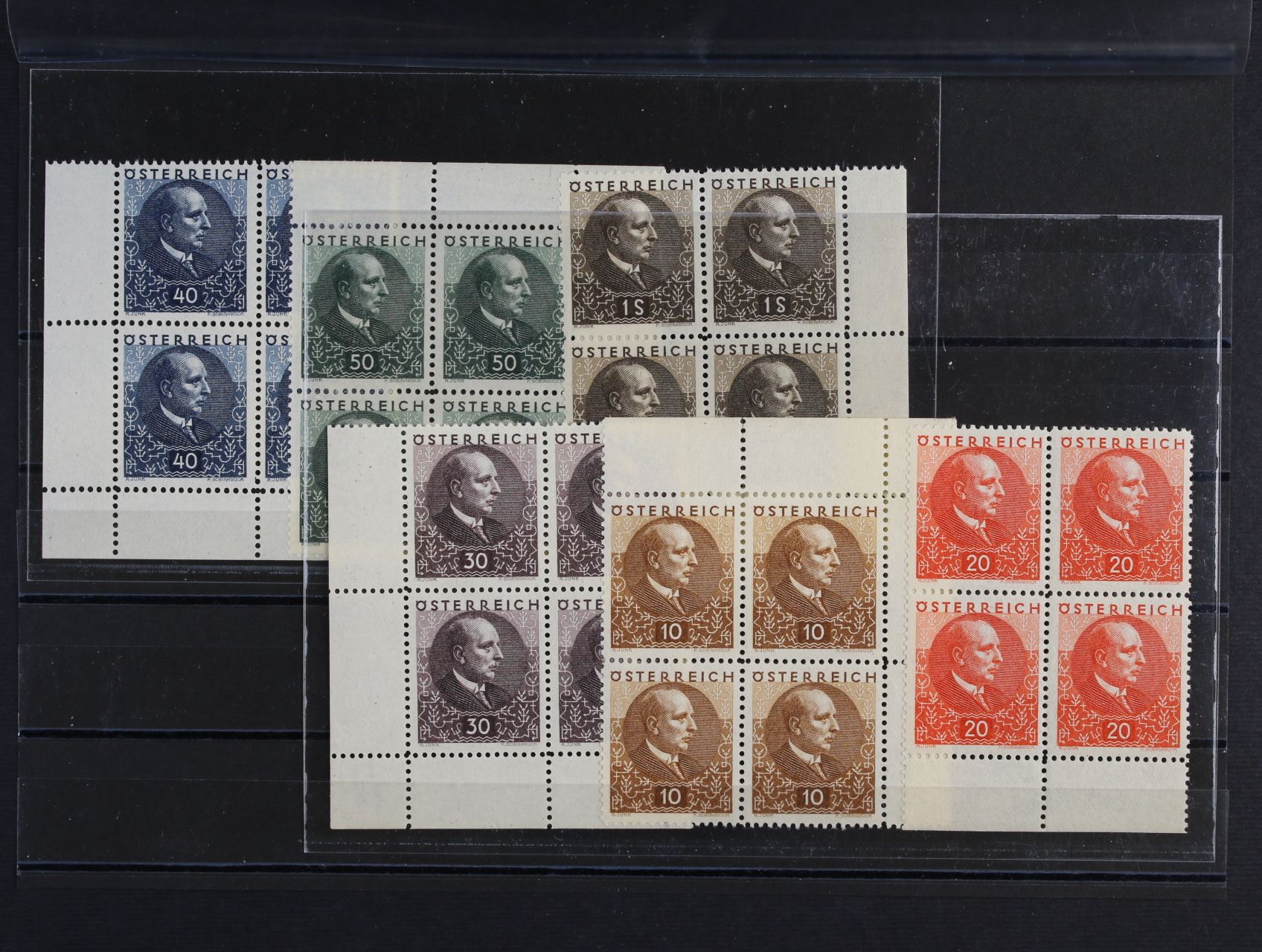 zn. ANK. č. 512-517, Miklas , kompletní serie ve 4-blocích rohových nebo krajových, kat .900 EUR